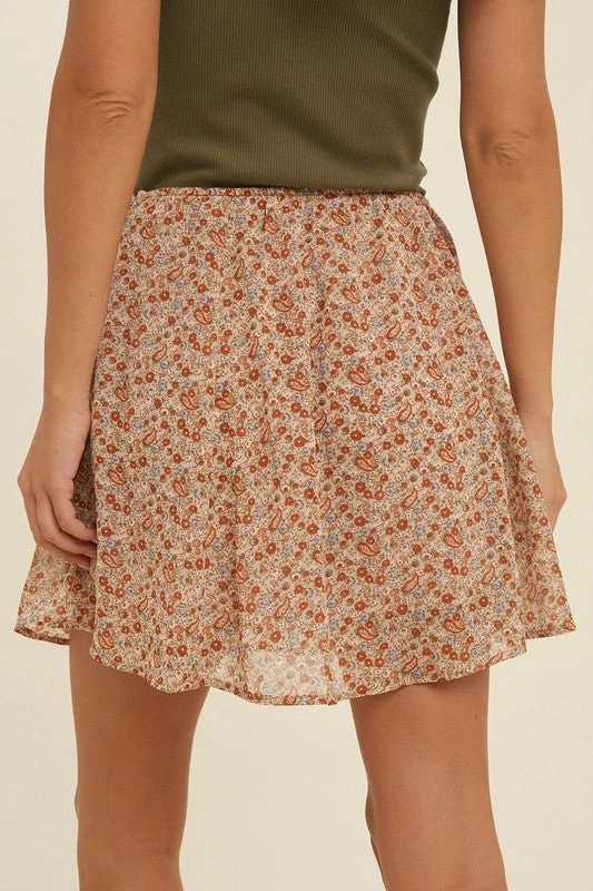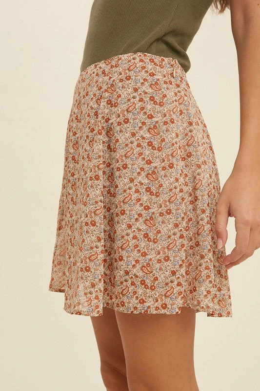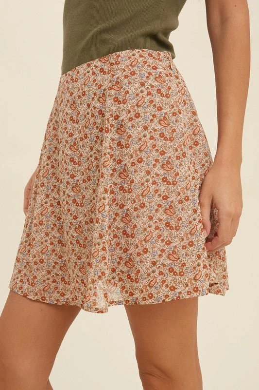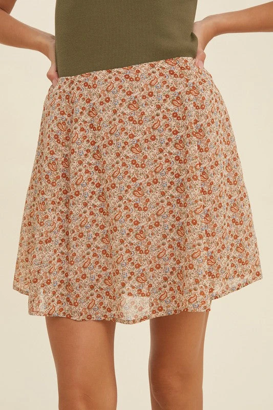 What a cute skirt! Apricot mini skirt features paisley floral print, elastic in back waistline, zipper closure on the side, and lined with shorts. So fun, and easy to dress up or down! Perfect with wedges or booties, and a cute denim jacket. Floral colors include ivory, blue, green, dark orange and light orange.