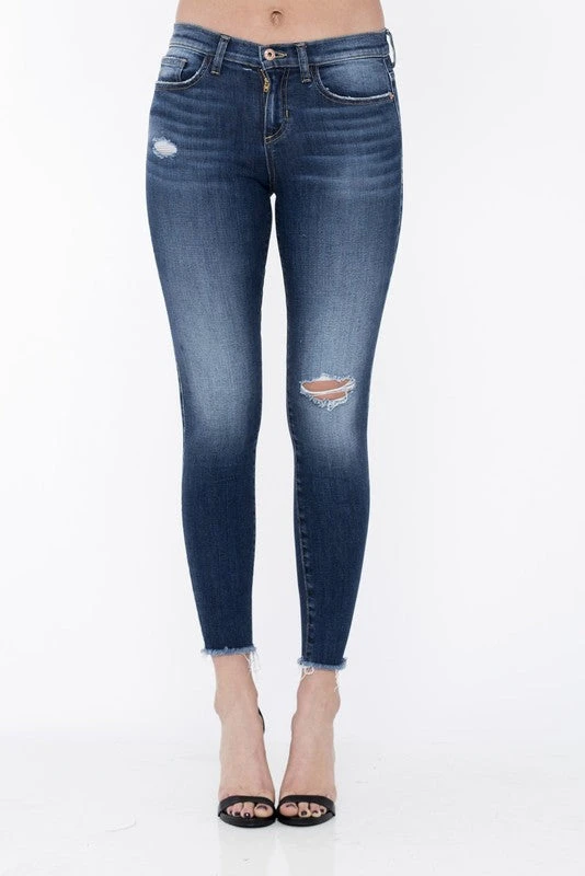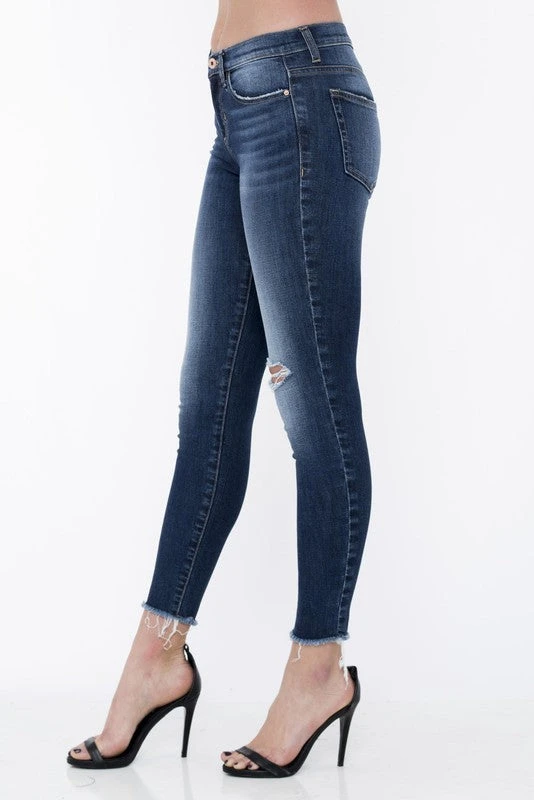 LIGHTLY DISTRESSED MID RISE SKINNY JEANS WITH AN UNFINISHED HEM