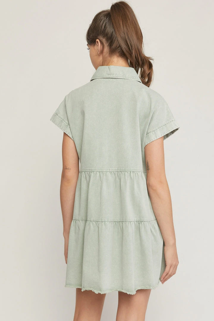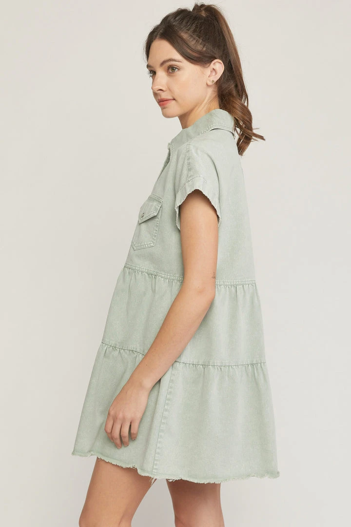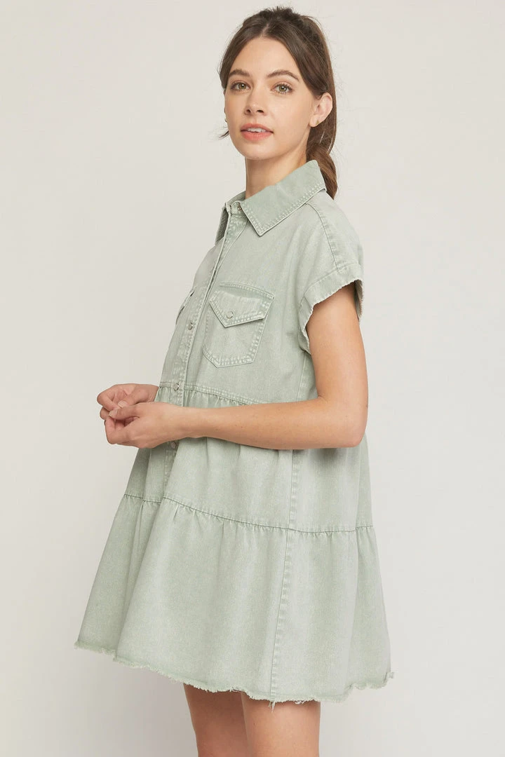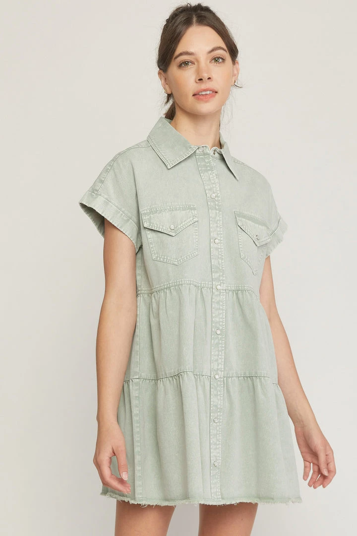 Oh my denimness! This one is sooo CUTE!! Featuring washed seafoam denim, snap front closure with collar, two front chest pockets, tiered layers, and raw bottom hemline. She’s a comfy relaxed fit, and perfect for the upcoming seasons! Just throw on your wedges and chunky earrings for a dressier look, or your fav boots and hoops for all of those Summer concerts!