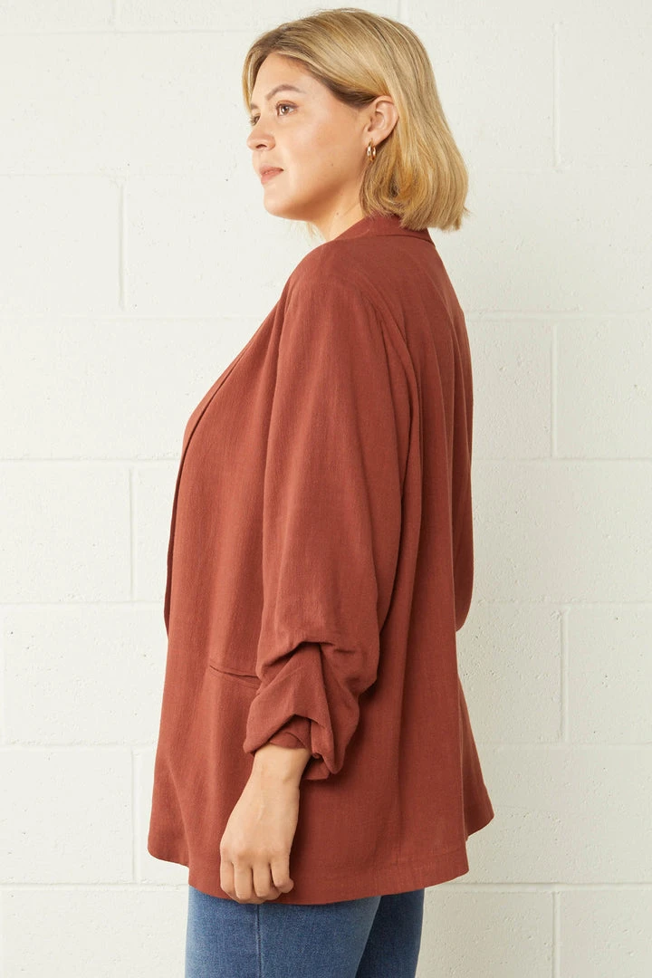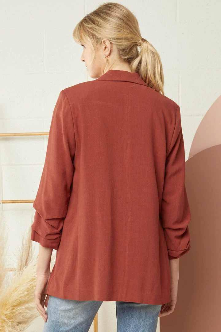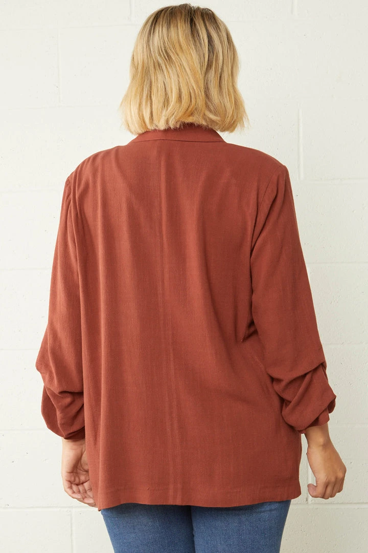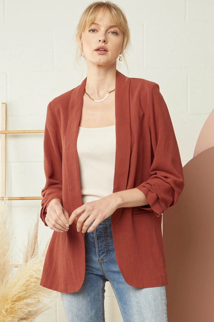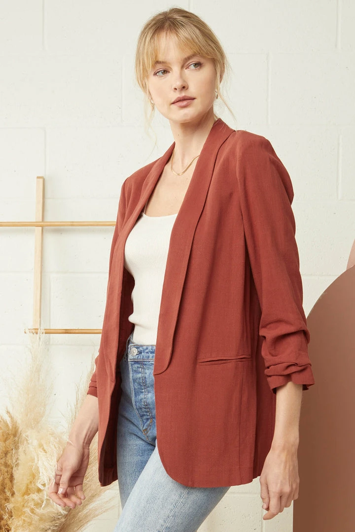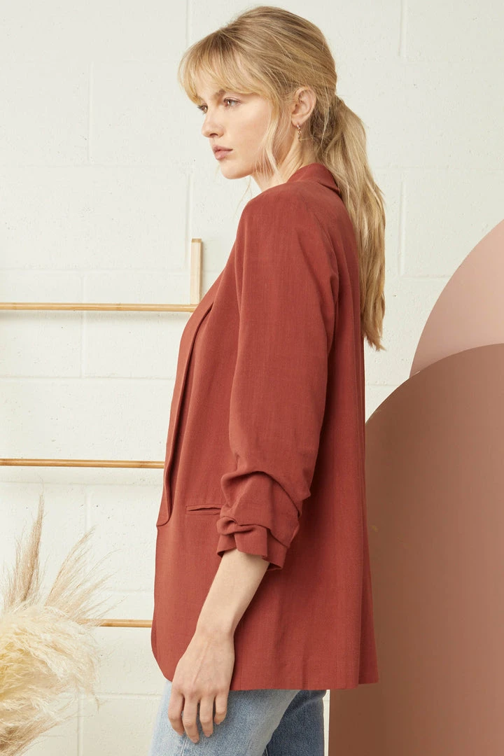 Blazers are all the trend right now, and this cognac one is perfect for you! This beauty features a woven fabric, with shirred detailing on the long sleeves. She also has a relaxed silhouette fit, with faux pockets for a tailored look that lays smooth, and a small shoulder pad to give it just the right Omph! Dress this baby up or down!