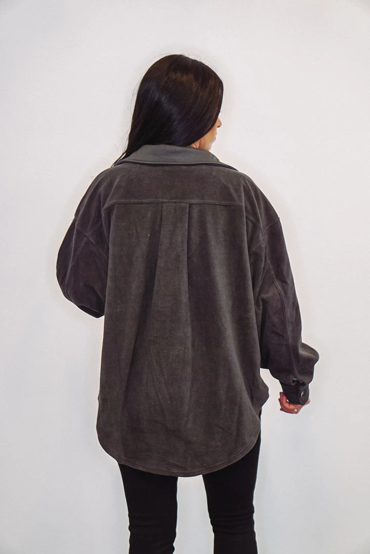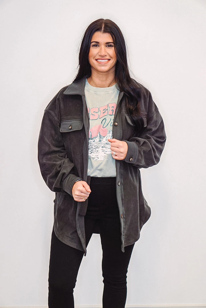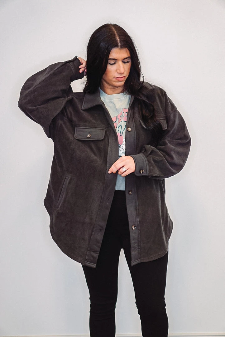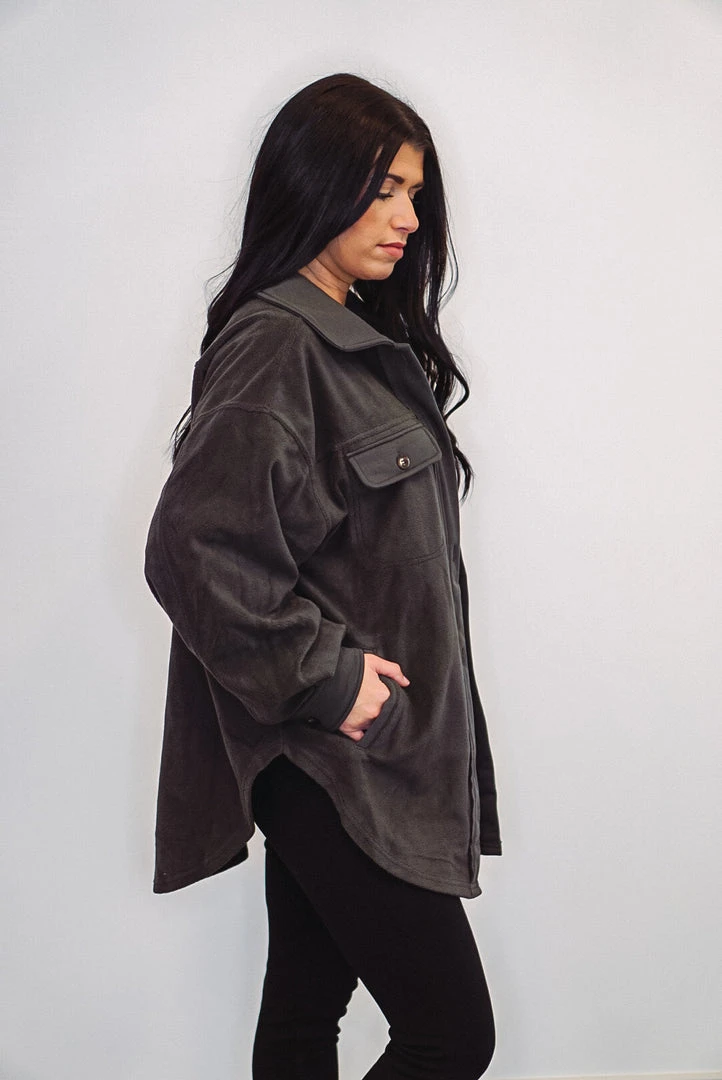 We are obsessed with this charcoal jacket! It is definitely a must have this season. Featuring button front chest pockets, open side pockets, a button front closure, button closure long sleeve cuffs, and a soft fleece fabric to keep you cozy and warm. Plus the rounded bottom hemline creates a flattering length! She’ll be the perfect addition to your wardrobe, and can be worn several ways!