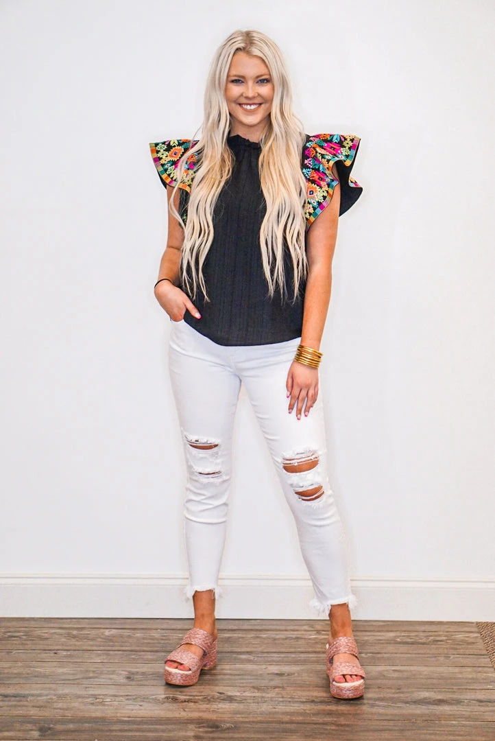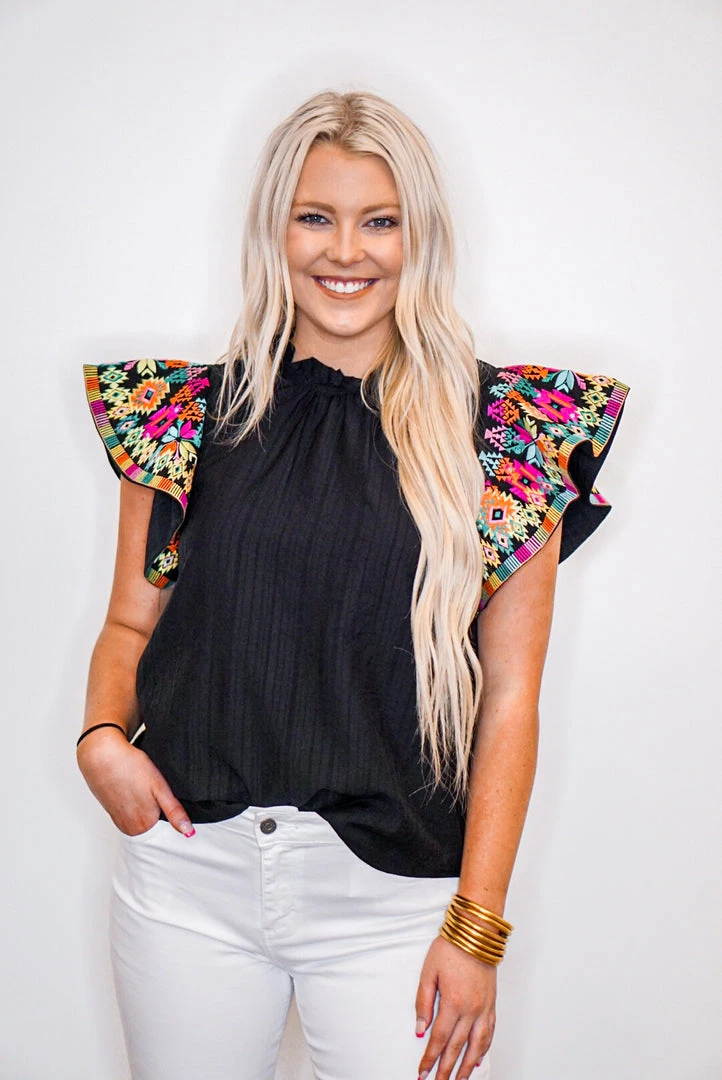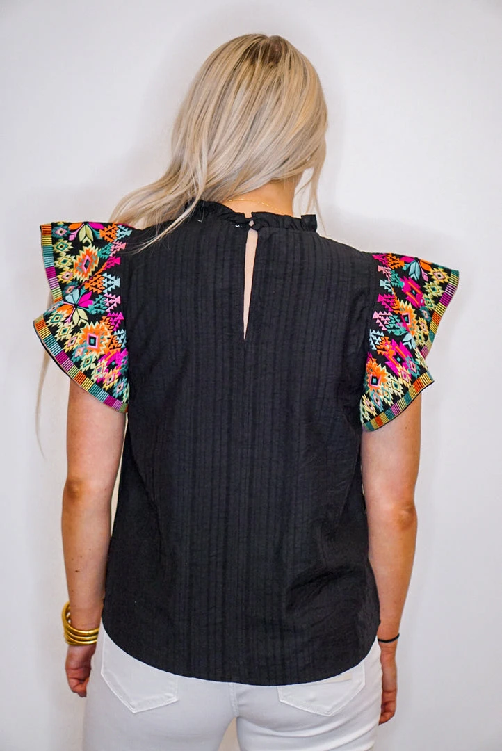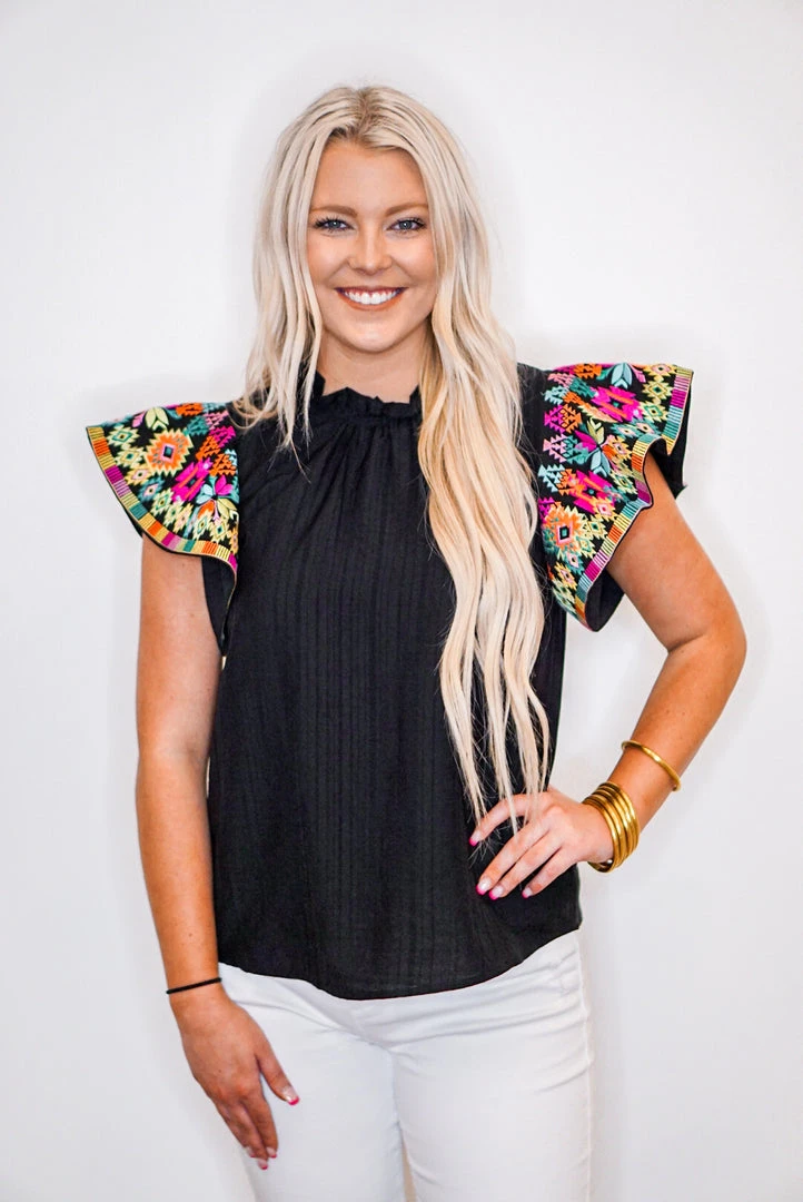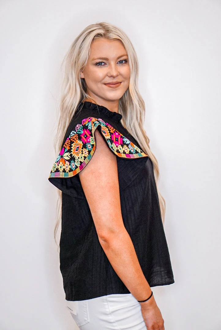 This adorable blouse is one of our new favs! Featuring black lightweight fabric with multicolor aztec print embroidered flutter sleeves, and a ruffle mock neck with keyhole button closure in back. The lightweight crinkle fabric makes this one so comfy as well as super cute. We just love how fun she is! Embroidery colors: yellow, orange, hot pink, light pink, light green, dark teal, and light teal.