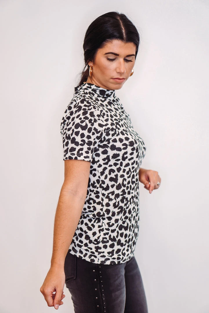 A classic top with a fun animal print you will see yourself wanting to wear everyday! Basic thermal blouse but with a TWIST! Top features a black leopard print, mock neck, short sleeves, and cut out one shoulder design. Pair with your favorite denim jeans for an easy and fun look!!