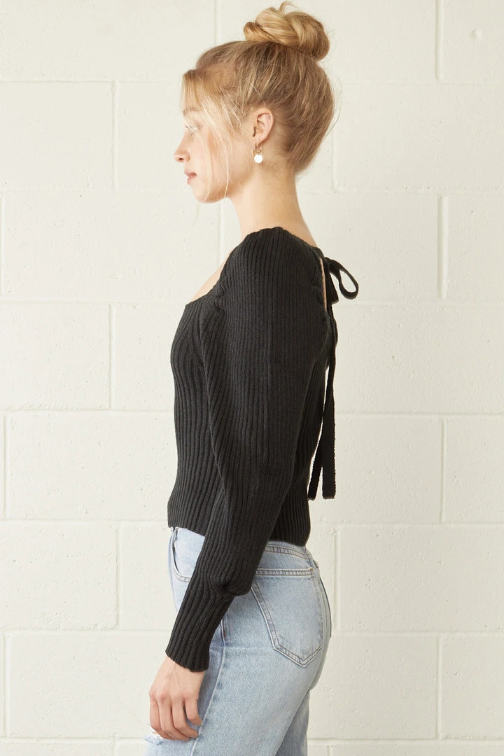 We are feeling all the feels with this adorable black sweater! Featuring ribbed knit fabric in a cropped style, with a chic squared neckline that has a self tie closure in the back. This cutie also has mutton long sleeves. Such a perfect top! Pair her with high waist jeans and your favorite wedges or booties for a super trendy and stylish day out.