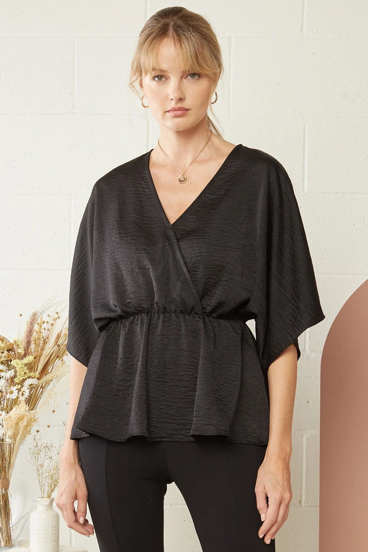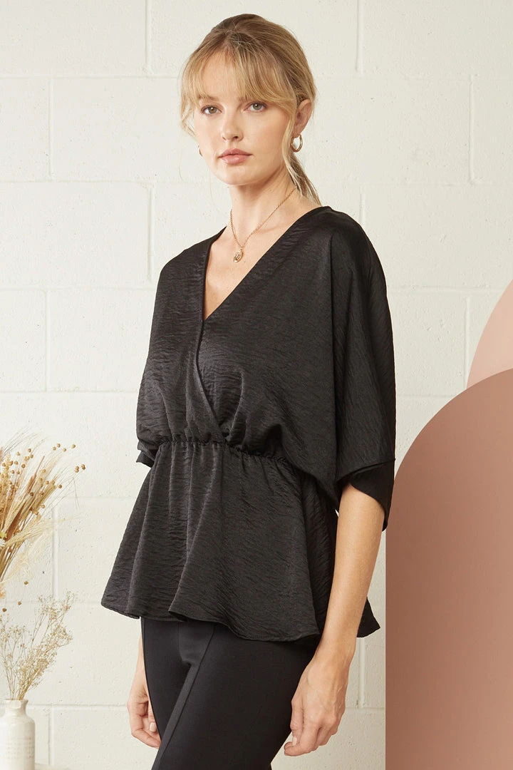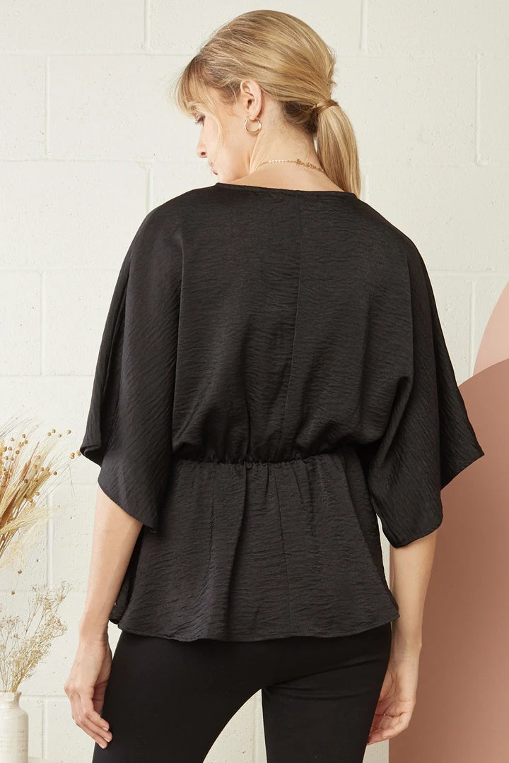 We are feeling all the feels with this adorable black blouse! Featuring satin fabric in a peplum and surplice style with v neckline. This cutie also has half sleeves and is lightweight. Such a perfect top! Pair her with high waist jeans and your favorite wedges or booties for a super trendy and stylish day out.