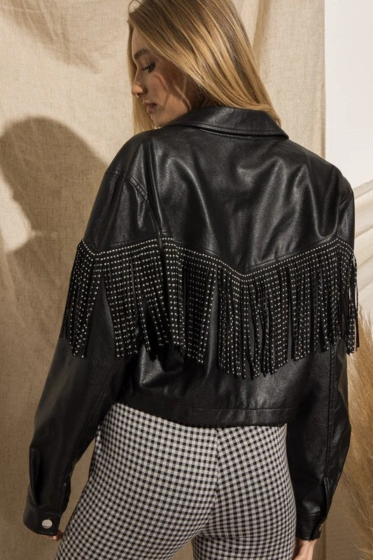Black faux leather jacket with silver studded fringe