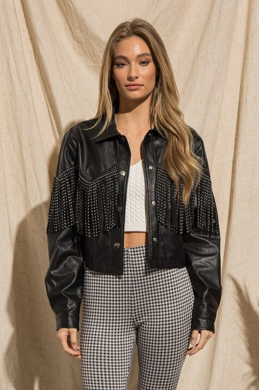 A leather jacket with a TWIST! This black faux leather jacket is a MUST have to rock all year long! Jacket features silver studded fringe across the chest in front and across the shoulders in back, and is semi cropped. This babe is perfection!