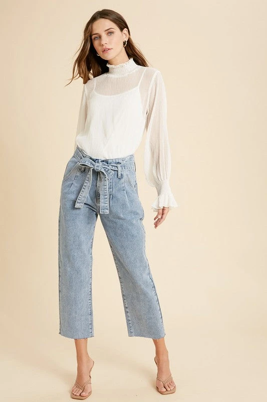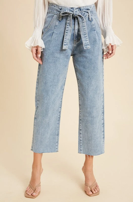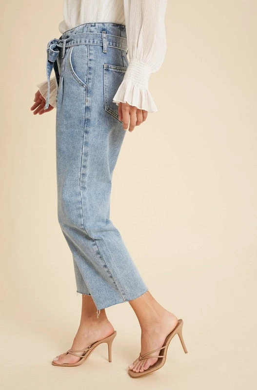 The ultimate paperbag pants, such a staple piece in your closet! Everybody needs a good go-to pair of denim jeans for dressier occasions and THIS is the perfect one. Featuring button and zipper closure, denim self tie belt, wide leg, raw hemlines, and functioning side and back pockets. Such a flattering fit while still being very comfortable, and fun!