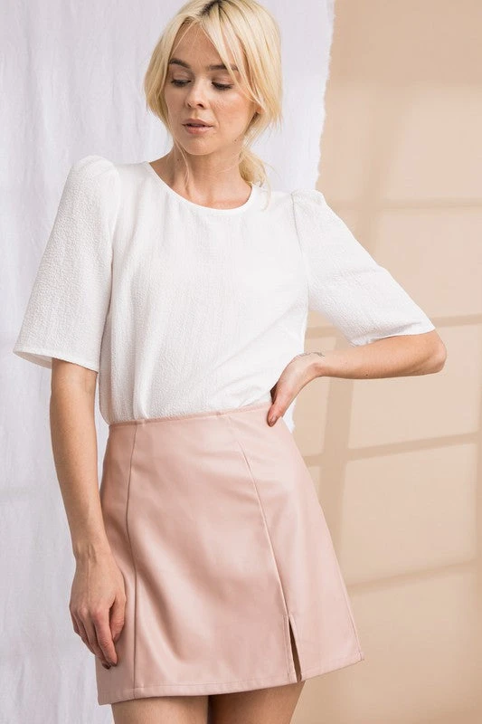 We are in cuteness overload with this blush faux leather mini skirt! She is definitely a fan fav featuring a side slit on the front bottom hemline, hidden side zipper with hook and eye closure, and fitted silhouette. Super cute and fun! Perfect with a white top for a more classic styled look, or throw her on with a graphic tee, denim jacket and boots for a more edgy look.