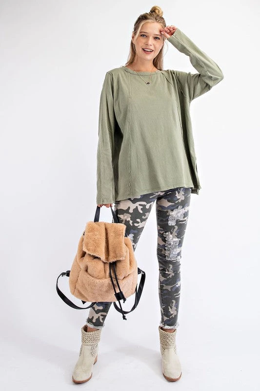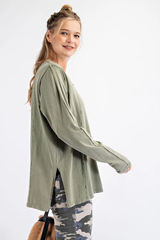 We are having all the love for this boxy knit pullover top! So comfy, and super cute, featuring mineral washed sage knit, crew neckline, raw seam details, long sleeves, and side slits in the bottom hemline for added comfort. You will love how great you feel in this babe, while running errands, hanging out with friends, or enjoying a much deserved day off. Soon to be your new favorite go-to!