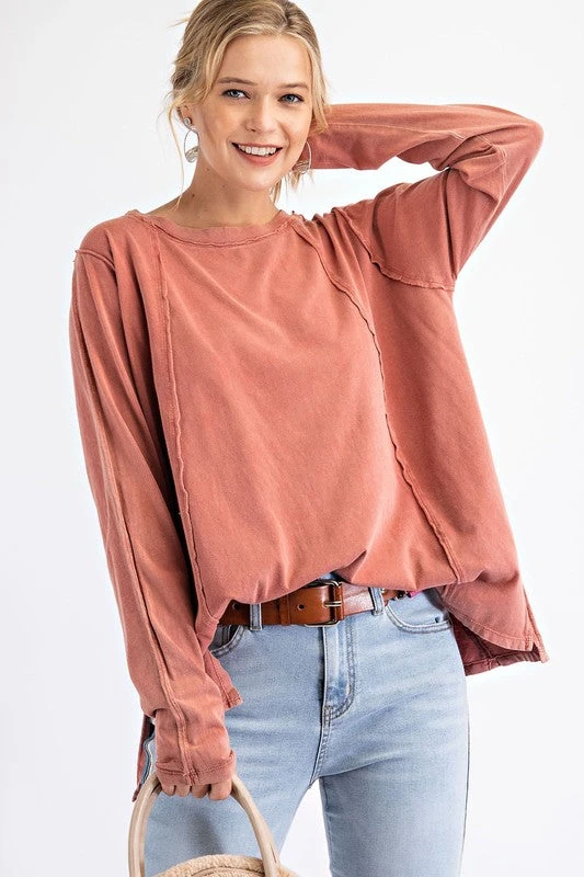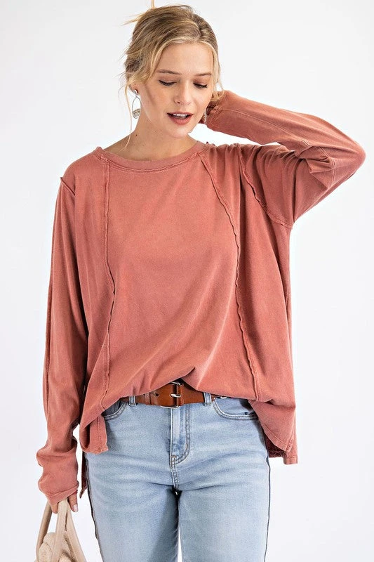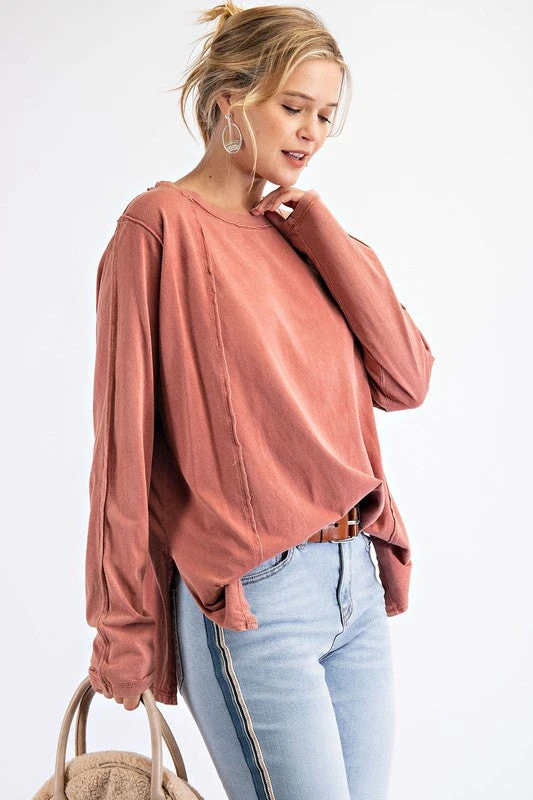 We are having all the love for this boxy knit pullover top! So comfy, and super cute, featuring mineral washed strawberry cream knit, crew neckline, raw seam details, long sleeves, and side slits in the bottom hemline for added comfort. You will love how great you feel in this babe, while running errands, hanging out with friends, or enjoying a much deserved day off. Soon to be your new favorite go-to!