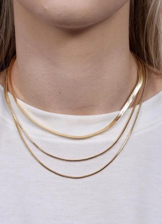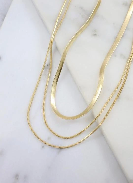 This triple layered necklace features three flat herringbone chains for an elegant look.