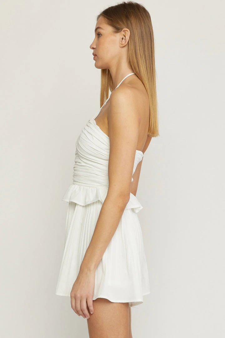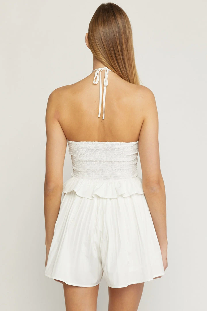 The cutest halter style pleated romper is perfect for all your bridal occasions! A must have for brides or anyone needing the perfect white romper. This little number features ruffle detail at waist and smocking at back.