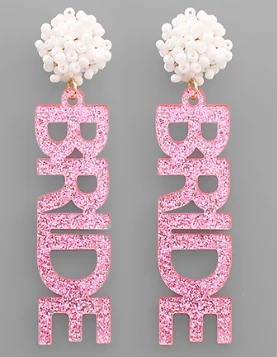 These super cute earrings are a must have for any soon to be bride. Perfect for all of her special occasions! Pink glitter acrylic dangle earrings that say “BRIDE” with a white beaded top at the post.