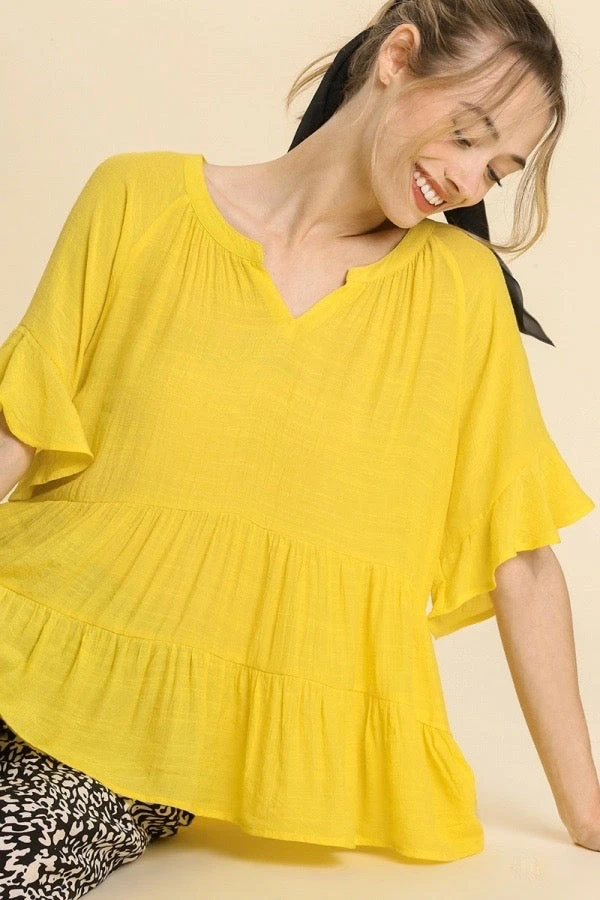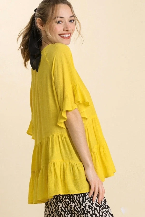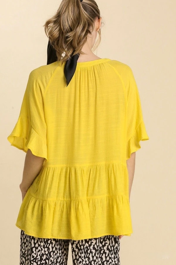 Brighter days ahead while wearing this babe! Such a fun lemon yellow color that is perfect for summertime! Babydoll top features a mandarin collar split neck, bell ruffle sleeves, tiered details.