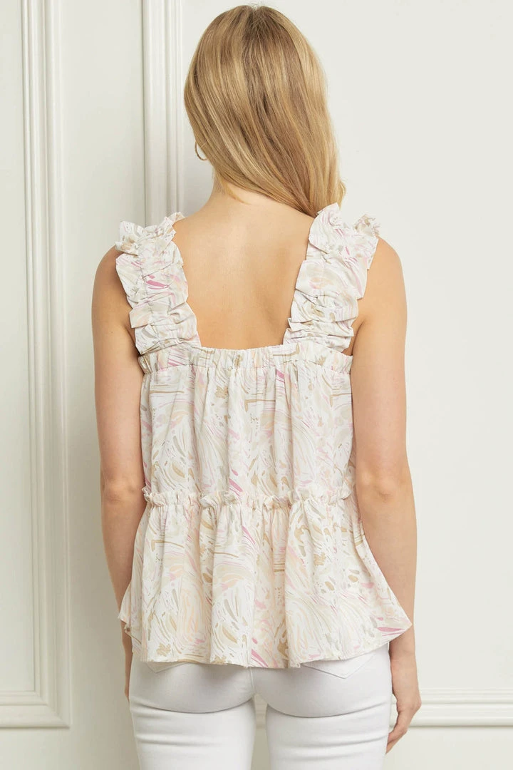 Sleeveless ivory brush stroke print tiered top