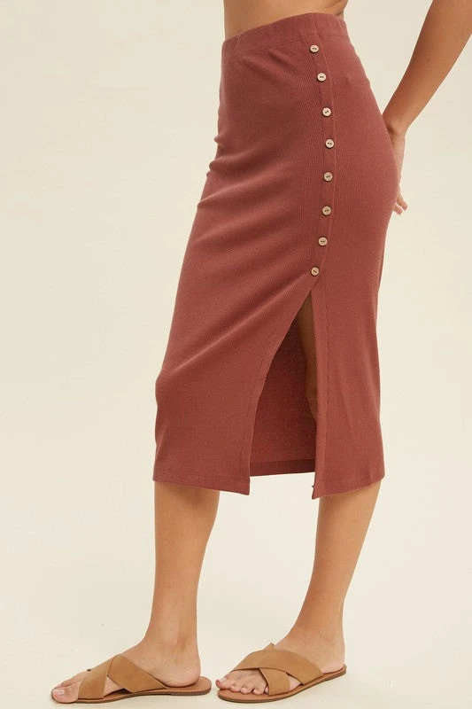 Burl wood ribbed knit midi skirt with buttons
