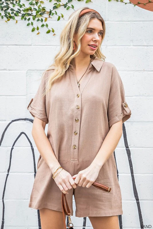 The must have romper for all your summer occasions. From date nights to beach vacations, you will be adorable in this trendy button down romper!! Features v neckline with collar, button down front, button cuffed short sleeves, side pockets, and back pockets. Sooo cute!