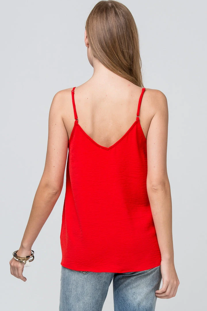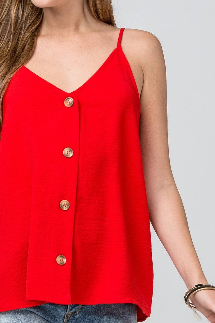 Solid button-up camisole top featuring v-neckline. Adjustable straps. Non-sheer. Woven. Lightweight.