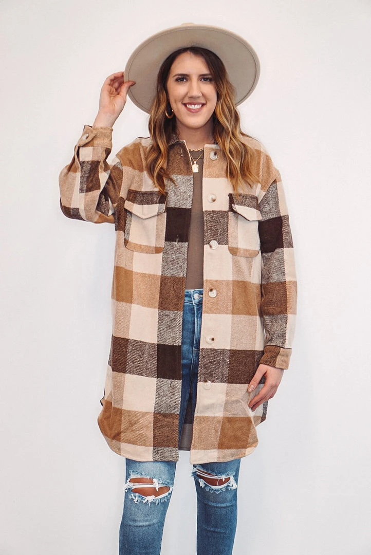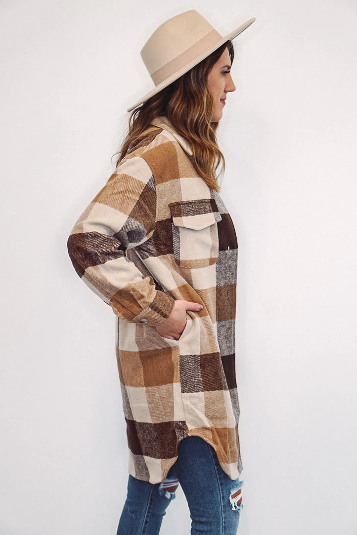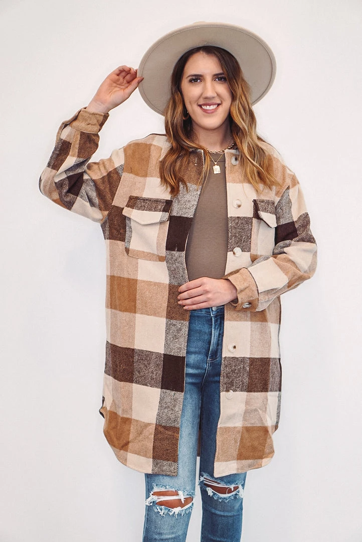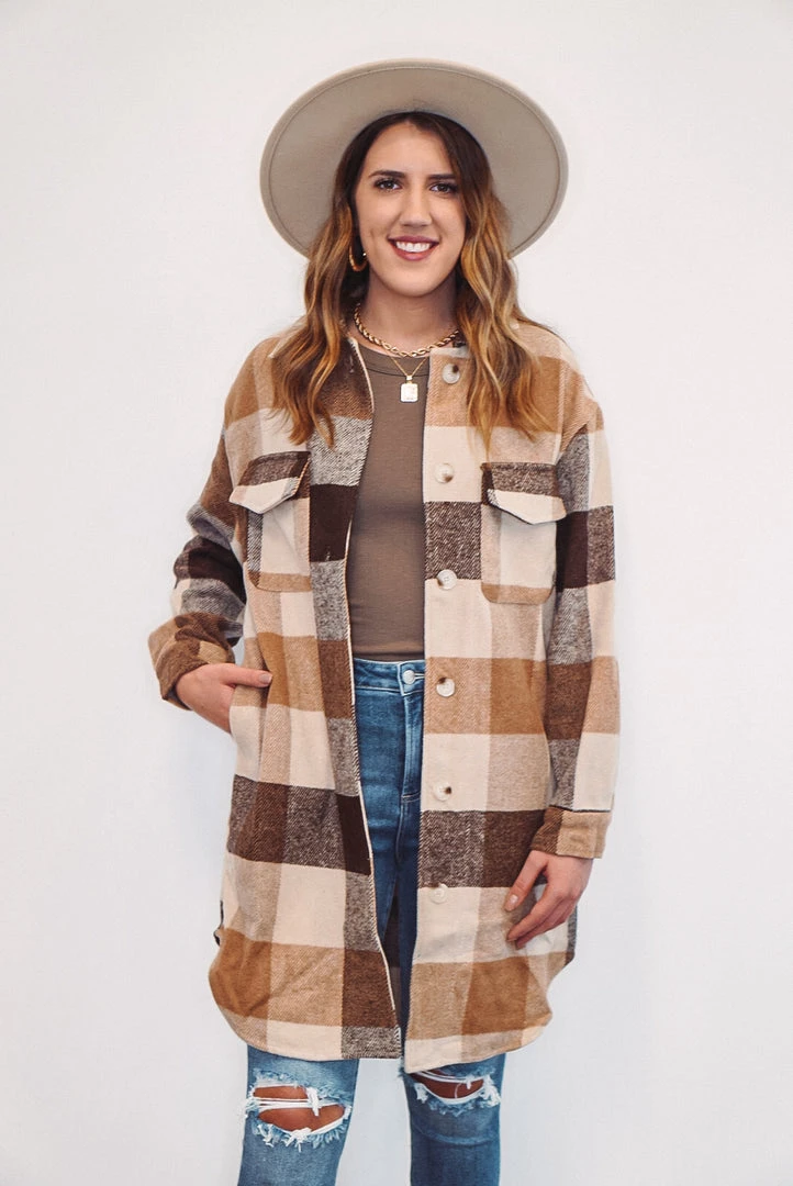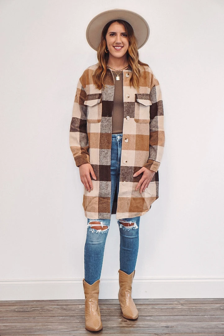 We are obsessed with this tan, brown and caramel color checkered plaid long jacket! It is definitely a must have this season! It features front chest pockets, side pockets, a button front closure, button closure long sleeve cuffs, and a soft fabric to keep you cozy and trendy. It’ll be the perfect addition to your wardrobe, and will look adorable paired with boots and booties!
