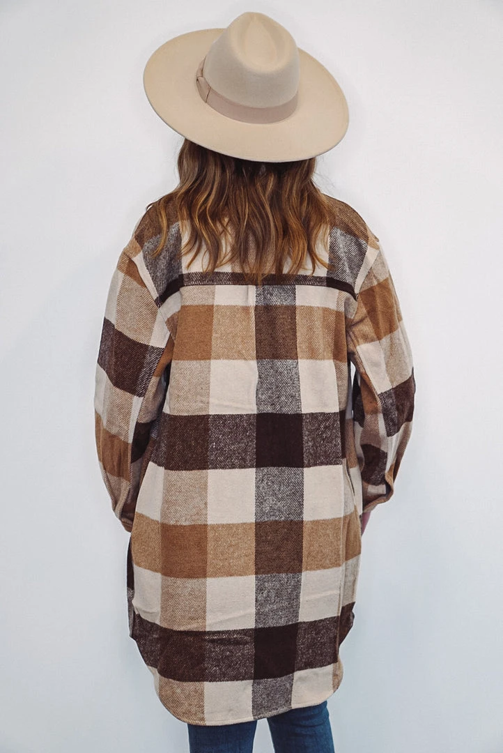 Tan, brown and caramel color long checkered plaid jacket