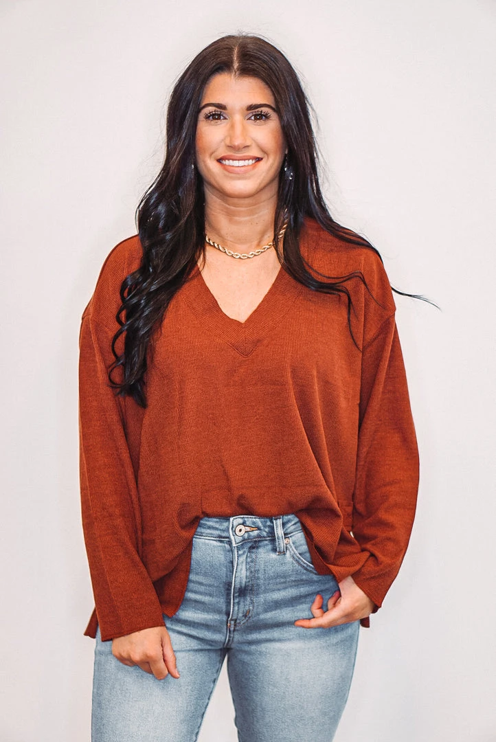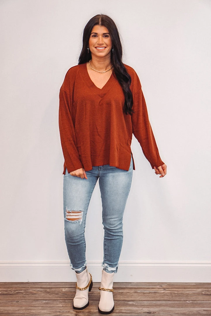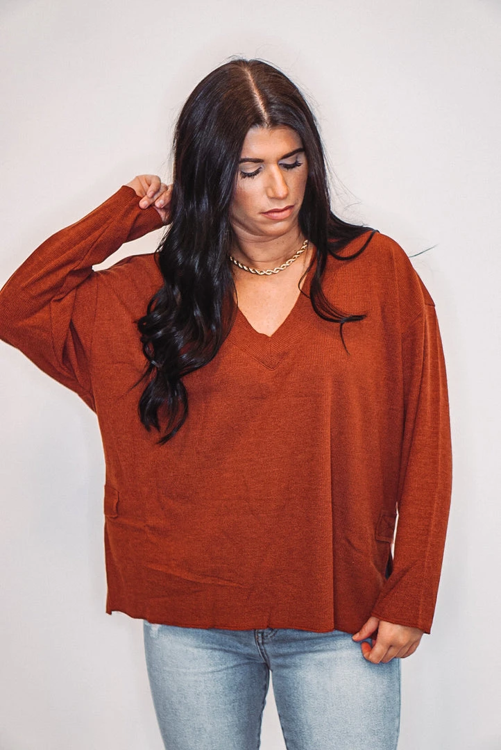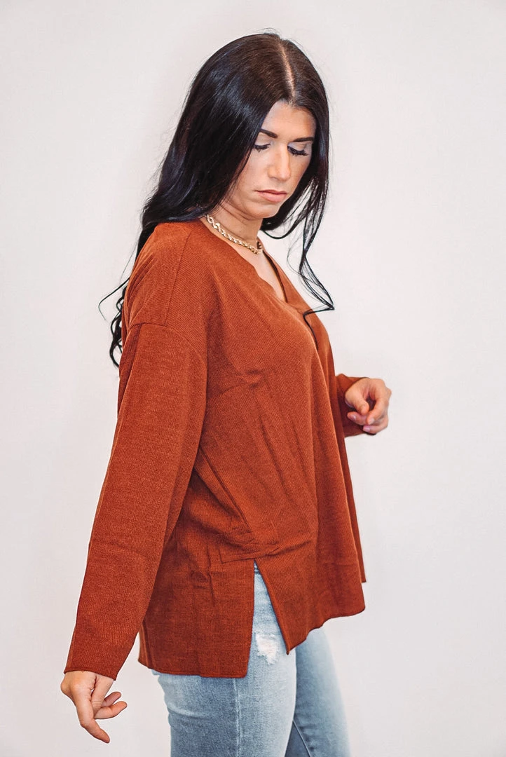 Such a fun pullover! Dark rust knit top with raw edge v neckline, long sleeves, and bottom hem side slits. Super cute and comfy! Will look fab over a sassy bralette with some distressed jeans and boots. Perfect for those upcoming chilly nights!