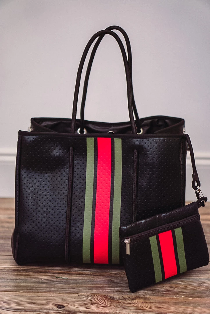The super lightweight neoprene tote bag that you need in your life! Not only is this bag a necessity for you, but also great for a gift! Small matching removable pouch inside! Nothing better than two bags in one! Tote features a middle snap closure, snaps on the side to allow bag to expand, two inside zippers, rope handles, hard botton liner.