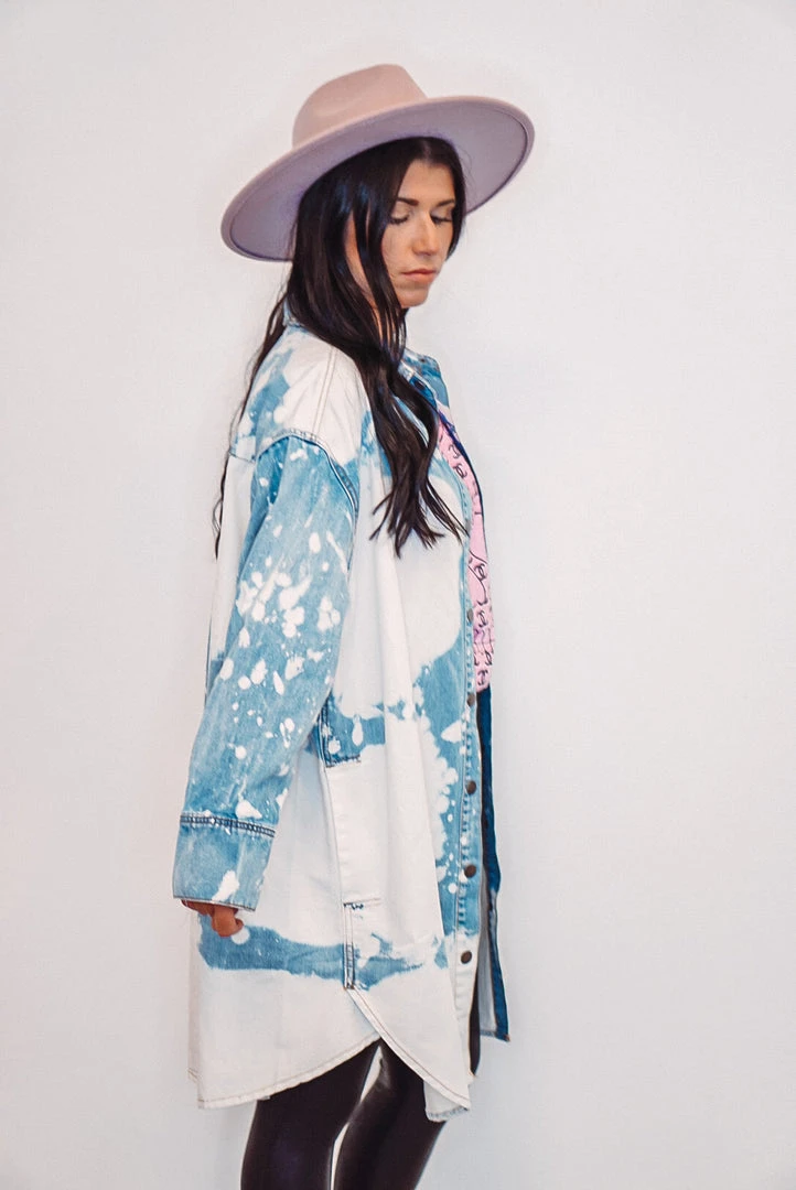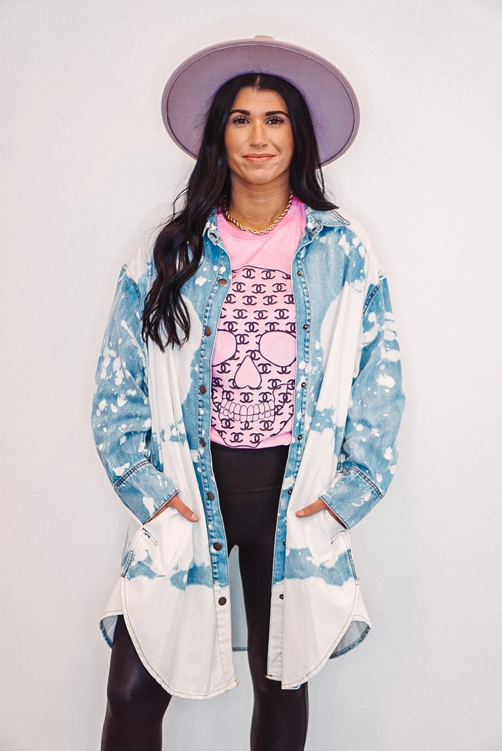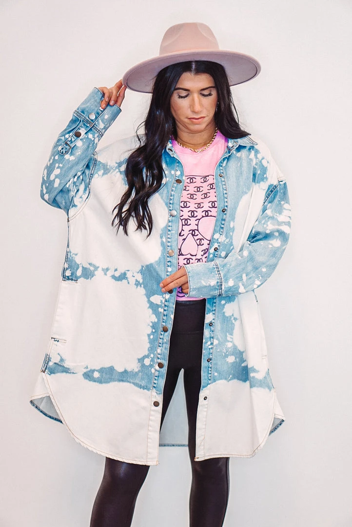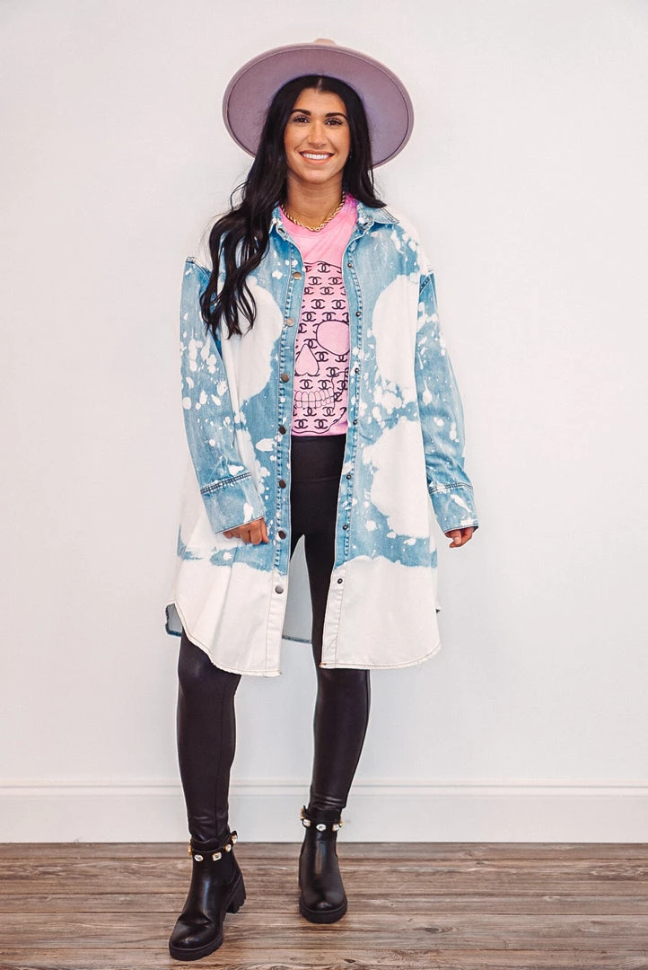 Oh my denimness! This one is so versatile as you can wear it as a dress, tunic top, or open front shacket top – so many options and ways to style. Featuring cloud washed denim, snap front closure with collar, and pockets. This cutie also has a rounded bottom hemline, triple snap cuffed sleeves, and a comfy relaxed fit.