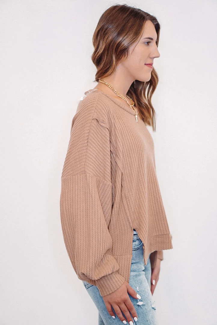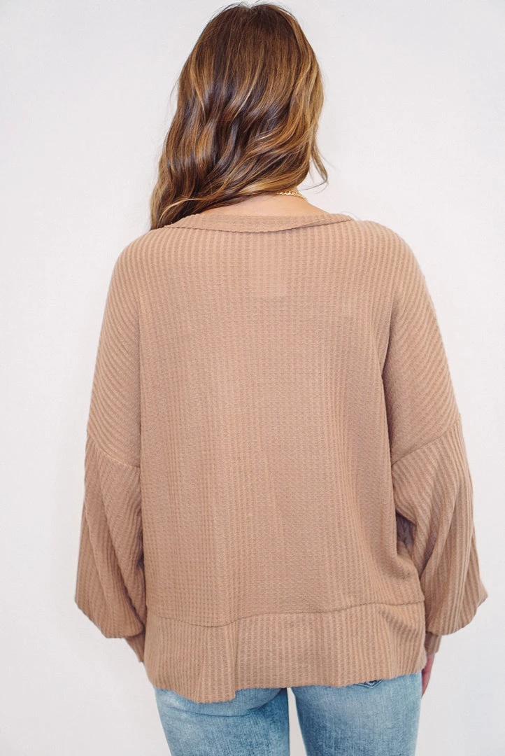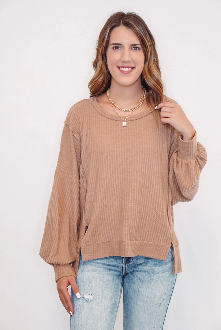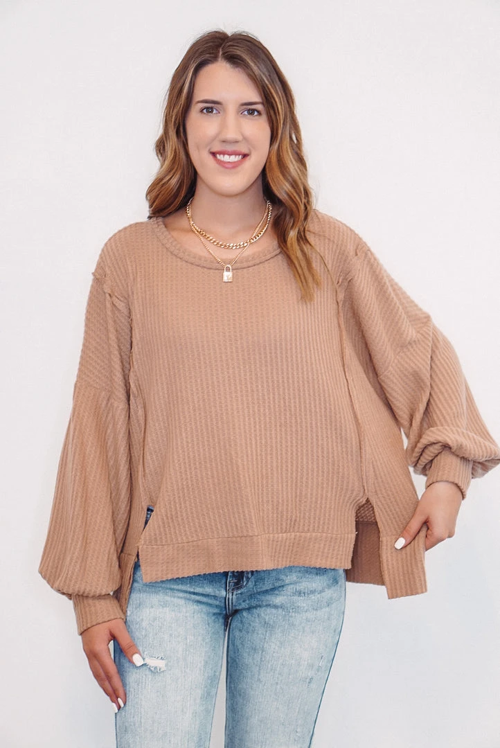 The ultimate knit top for Fall/Winter! You will be wearing this coco knit top every day. Why you ask? Because it’s the most comfiest, cutest little top ever! In love with the super soft textured waffle knit, and the raw seam details. This babe has long dolman sleeves, a small slit on each side at the bottom hemline, and is long enough to wear over leggings, or do a side a tuck with your favorite distressed jeans for a more fitted look.