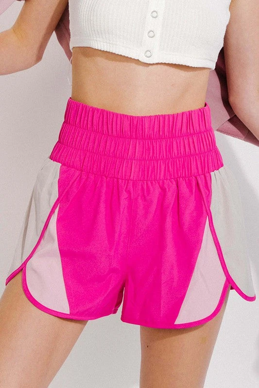 Elasticized highwaist active shorts in colorblock hot pink, light pink and light grey