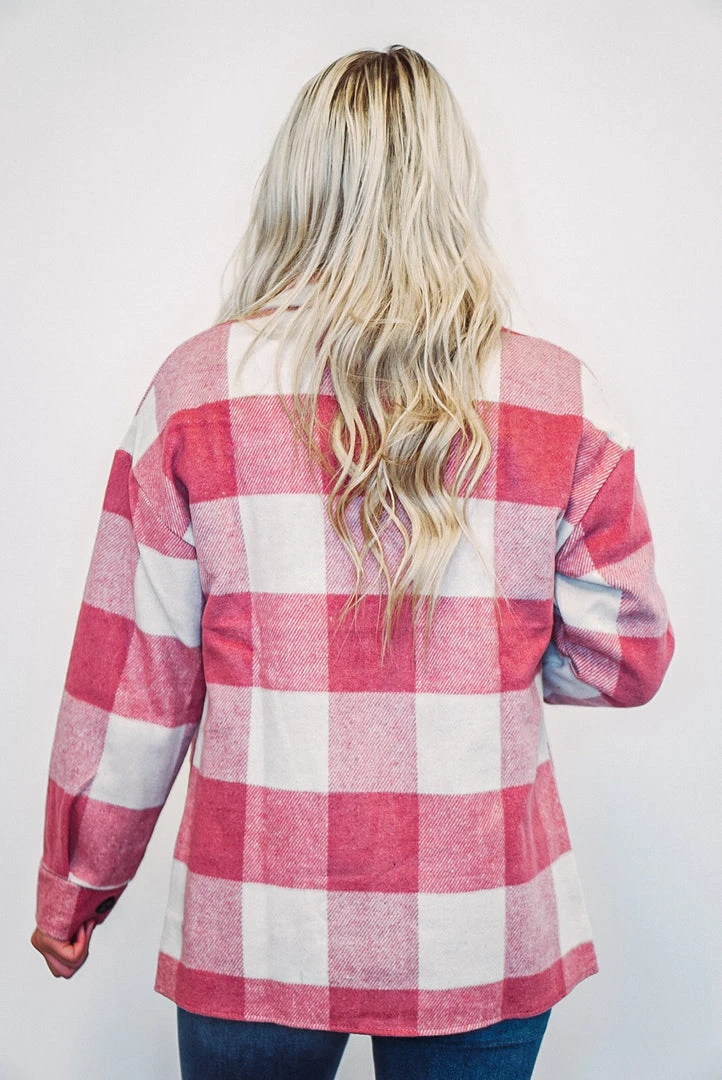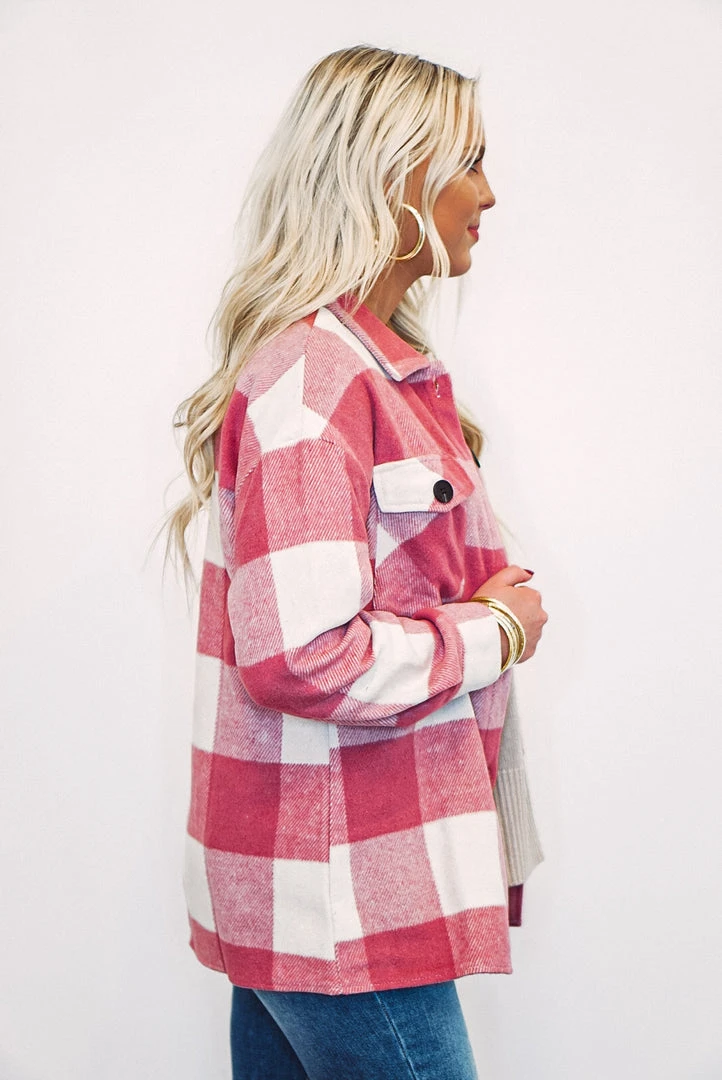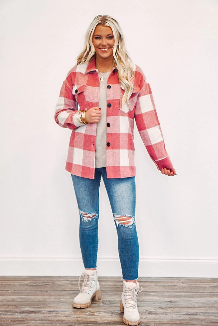 We are so in LOVE with this pink and white plaid flannel shacket! This babe features a button up style, two front chest pockets that button close, and a soft mid weight fabric to keep you warm and cozy. She’ll be the perfect addition to your wardrobe and great to layer with your bodysuits and jeans. We love the relaxed fit… this shacket is a must have!!