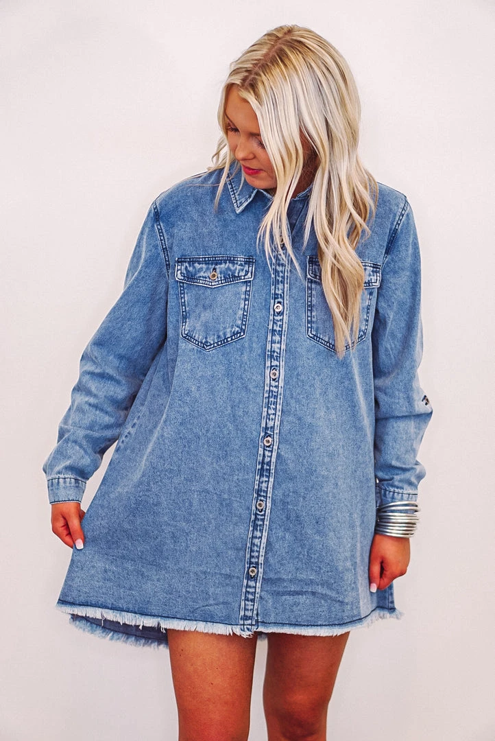 Oh my denimness! This one is sooo CUTE!! Featuring medium washed denim, button front closure with collar, two front chest pockets, and raw bottom hemline. She’s a comfy relaxed fit, and perfect for the upcoming seasons! Just throw on your wedges and chunky earrings for a dressier look, or your fav boots and hoops for all of those Summer concerts!