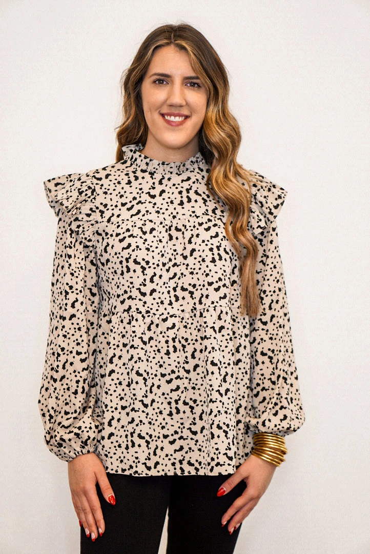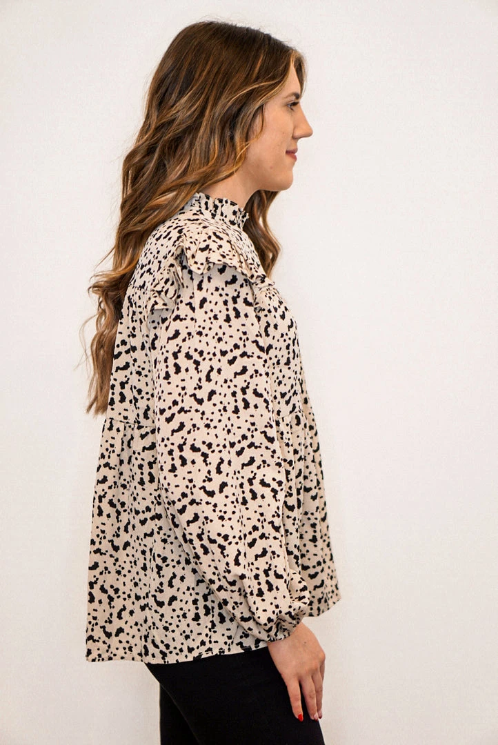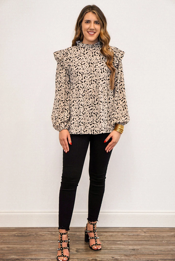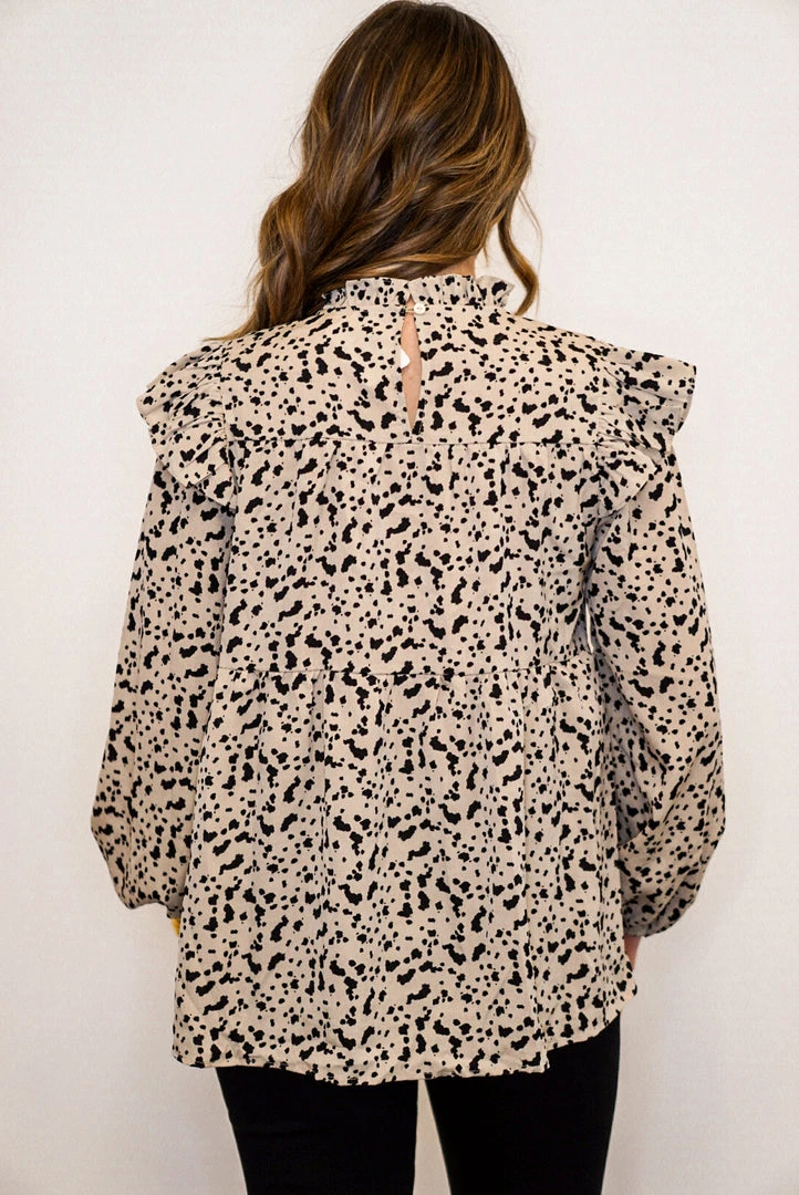 Cream dalmatian print ruffle tiered mock neck babydoll top