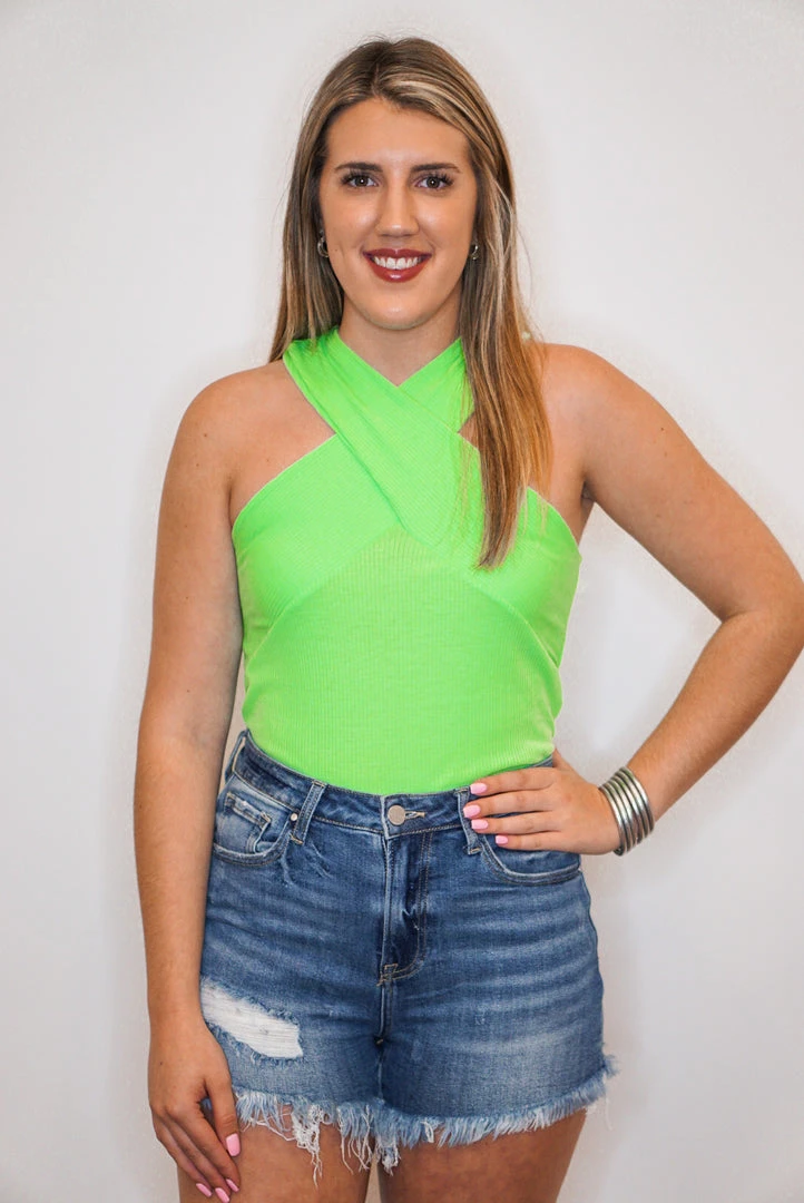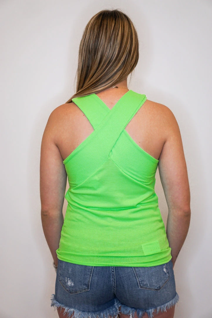 Neon lime criss cross halter tank top
