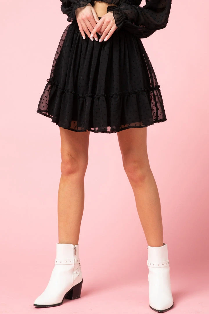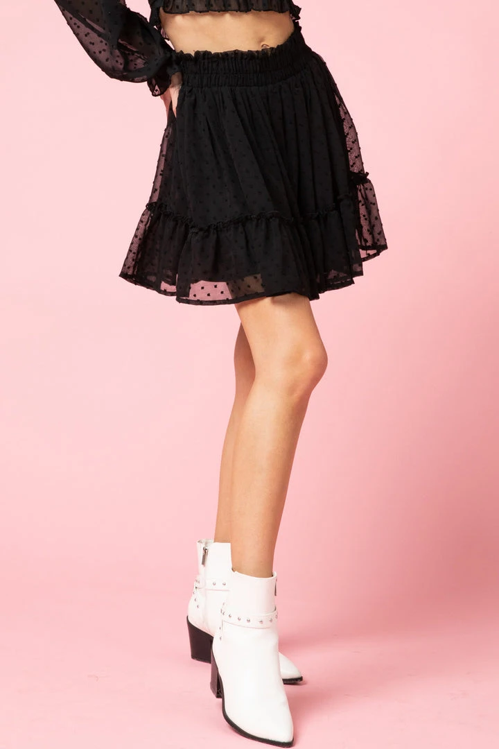 You’ll be the sweestest one in this sweet swiss dot skirt or maybe you’ll just look the part. Haha. Or add your favorite grapic tee for a not so sweet look, either way you’re gonna love this fun, flirty, sweet skirt. Black swiss dot skirt featuring ruffle detail at hem. Elastic waistband. Non-sheer. Woven.