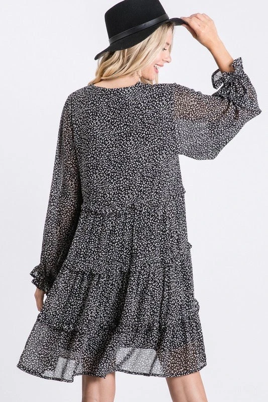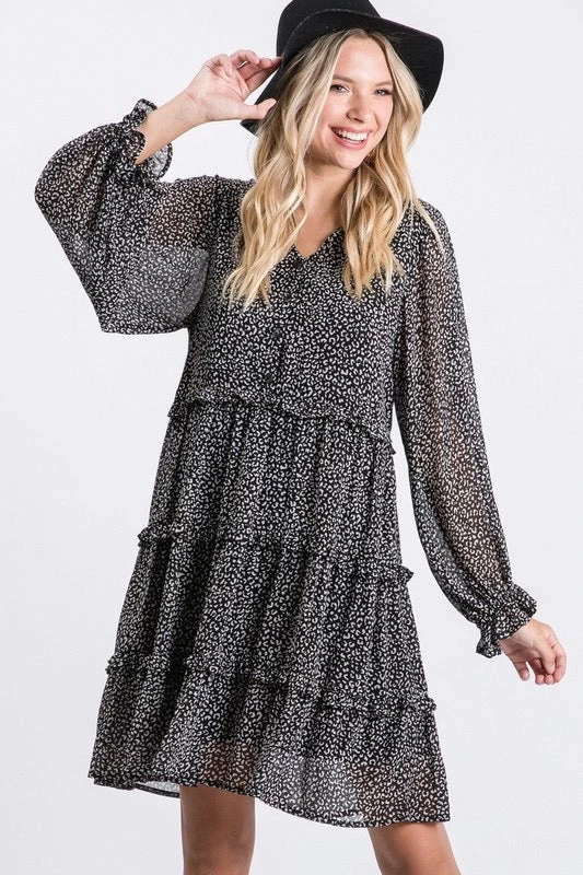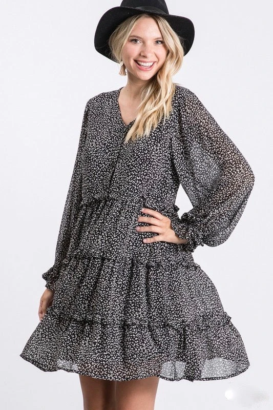 Leopard print chiffon dress with a V-neckline, long ruffle edge bubble sleeves, and a ruffle tiered skirt.
