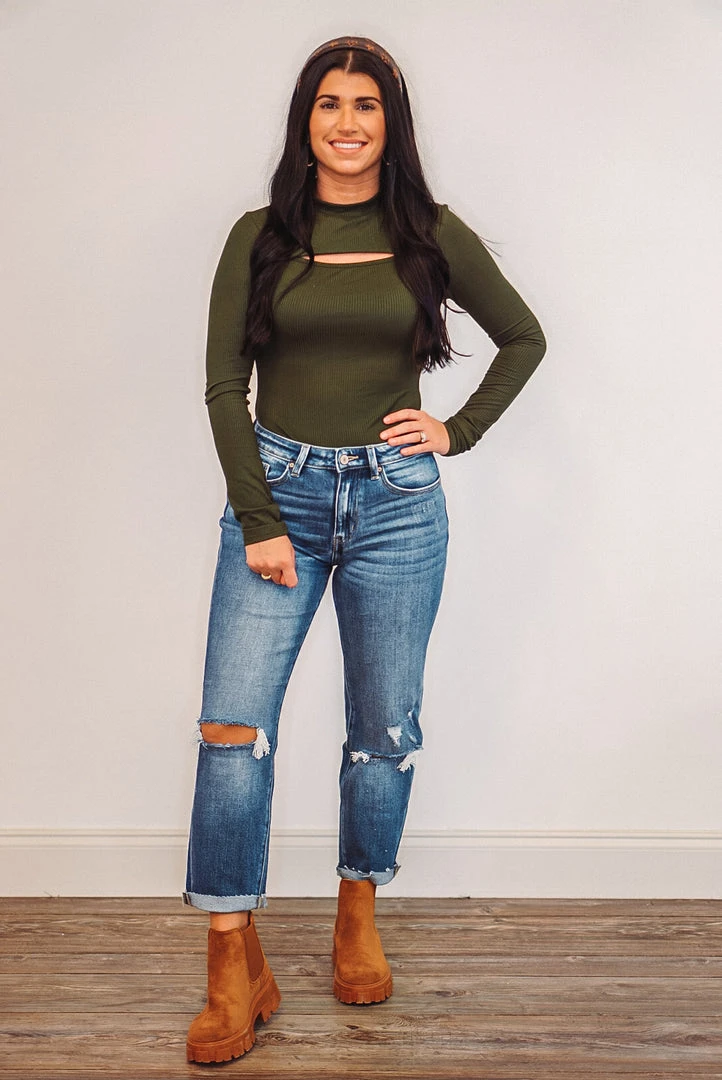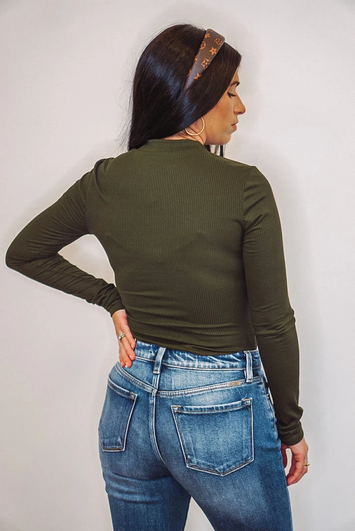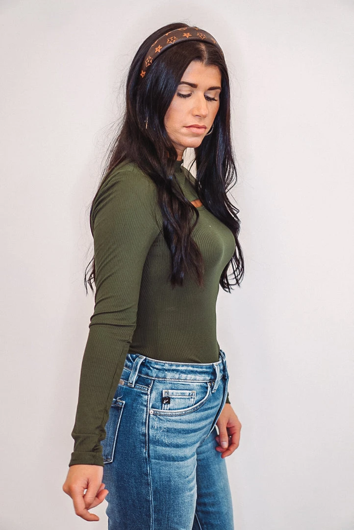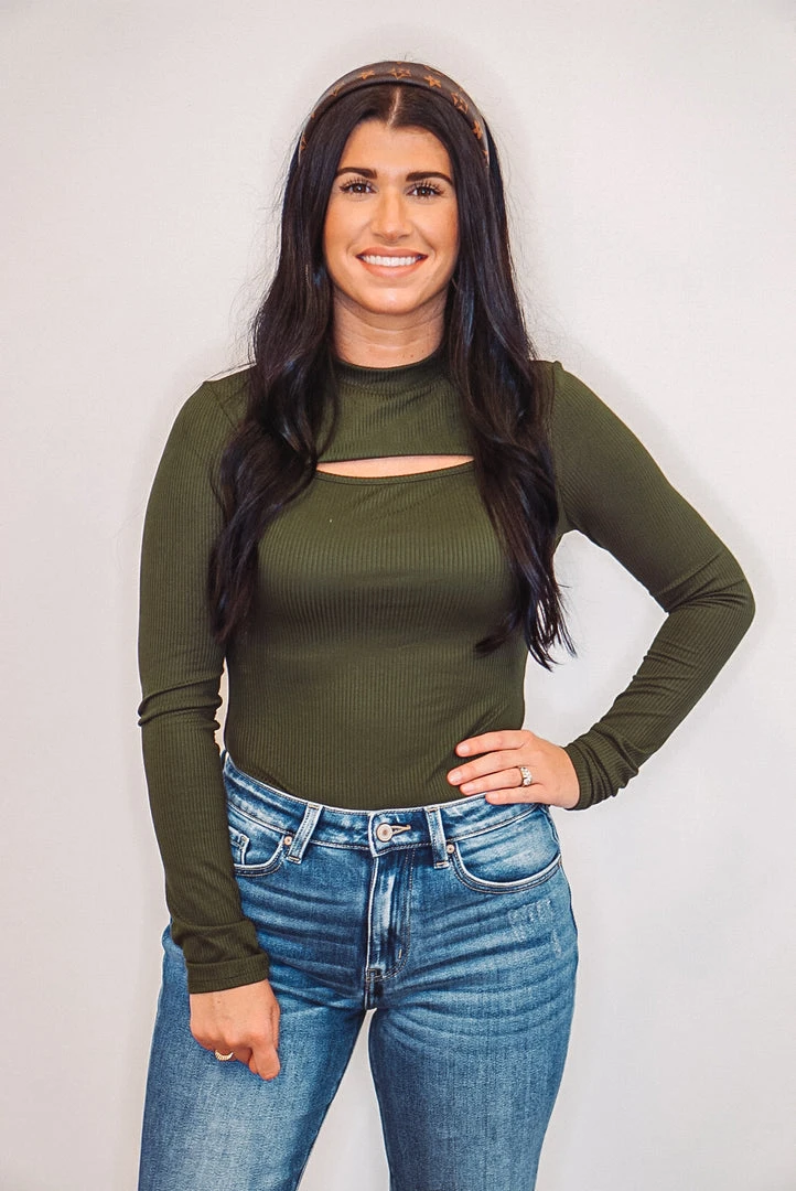 This olive bodysuit is the perfect addition to Fall or even Christmas! Featuring ribbed knit fabric, long sleeves, and a cut out just below the neckline. She is a thong style french cut, with snap closure. Perfect worn alone, or under your favorite kimono or cardigan.
