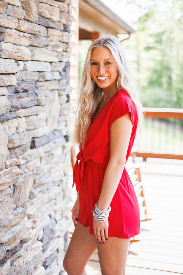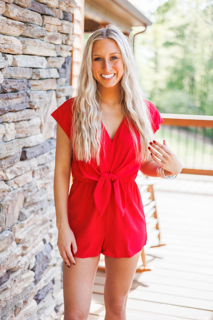 Red tie front romper with open back