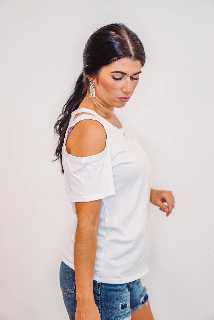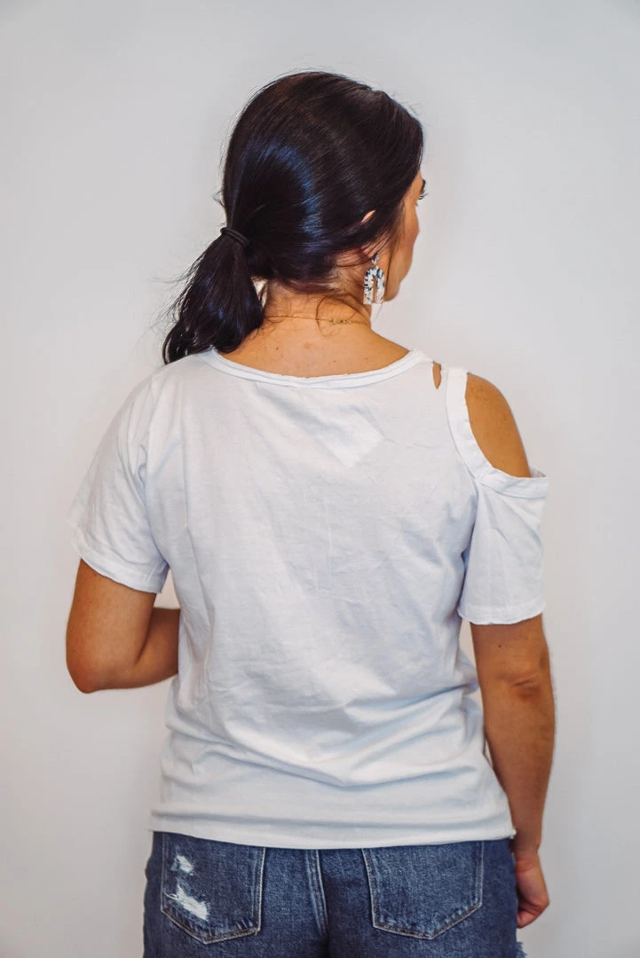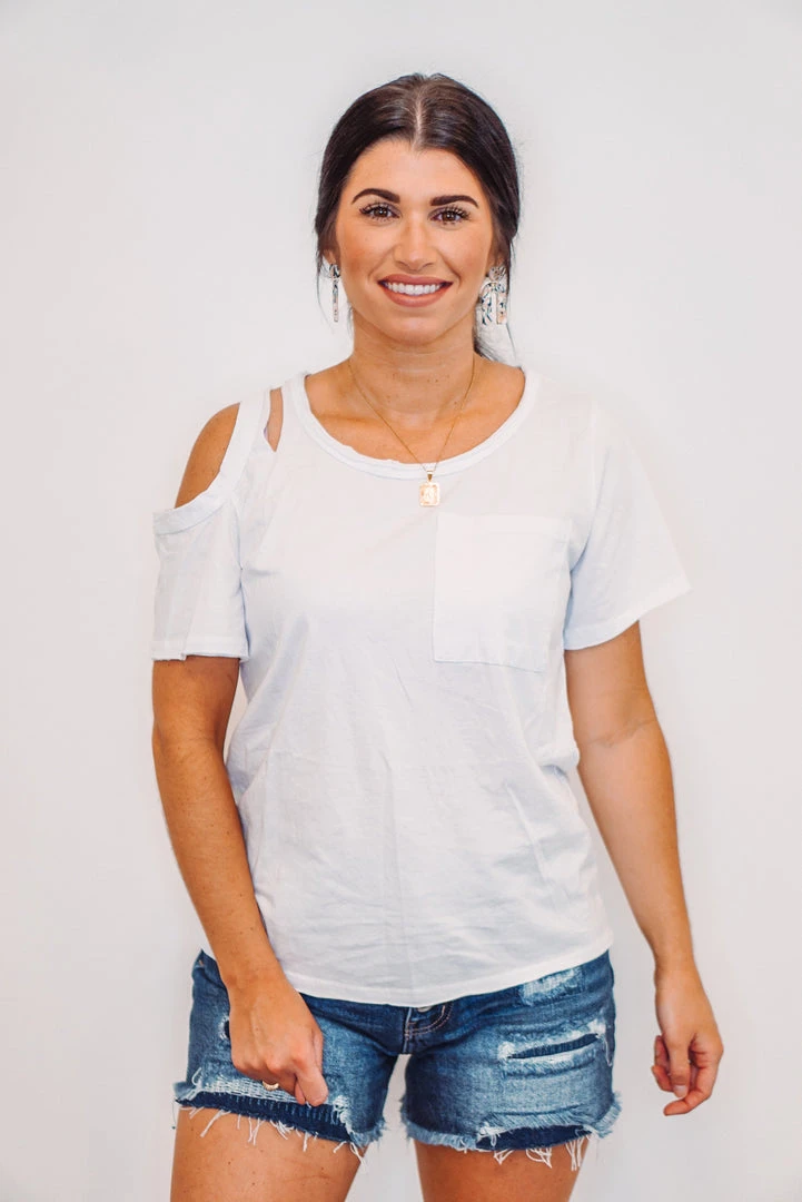 White Distressed Pocket Tee With Open Shoulder Detailing