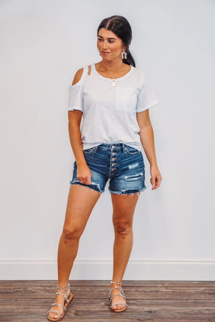 We love a good classic white tee, and this distressed babe is perfection! Featuring short sleeves, raw hems, a crew neckline, and cut out detailing on one shoulder. This super cute and comfy pocket tee has been washed numerous times to bring out the softness. You’re going to love her so much, you’ll want to wear her every day!
