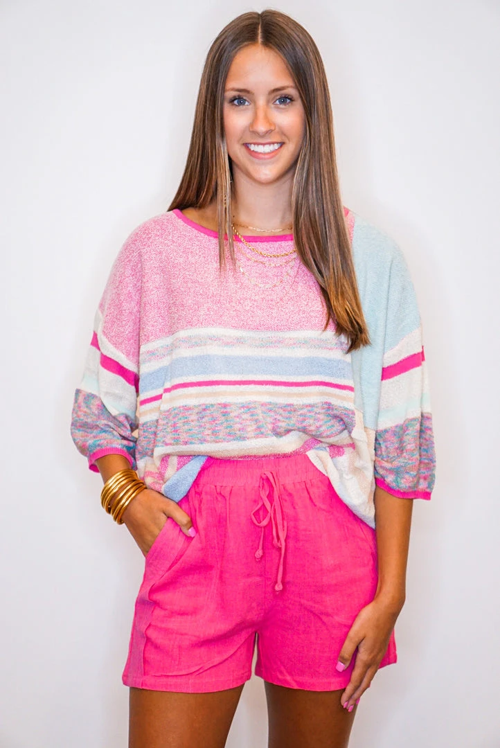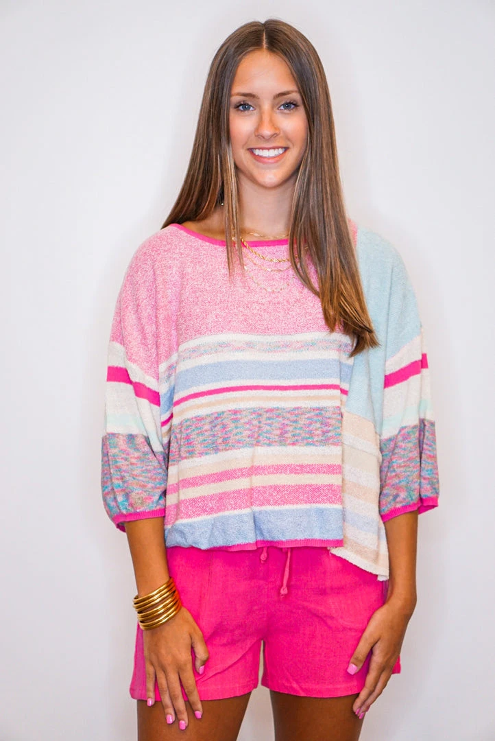 We are feeling all of the summer love with this adorable colorblock striped top! Featuring textured knit fabric in a cropped style, with a crew neckline, and drop shoulder short sleeves. The perfect top for those beachy Summer evenings! Colors: dark pink, light pink, blue, teal, tan, and ivory.