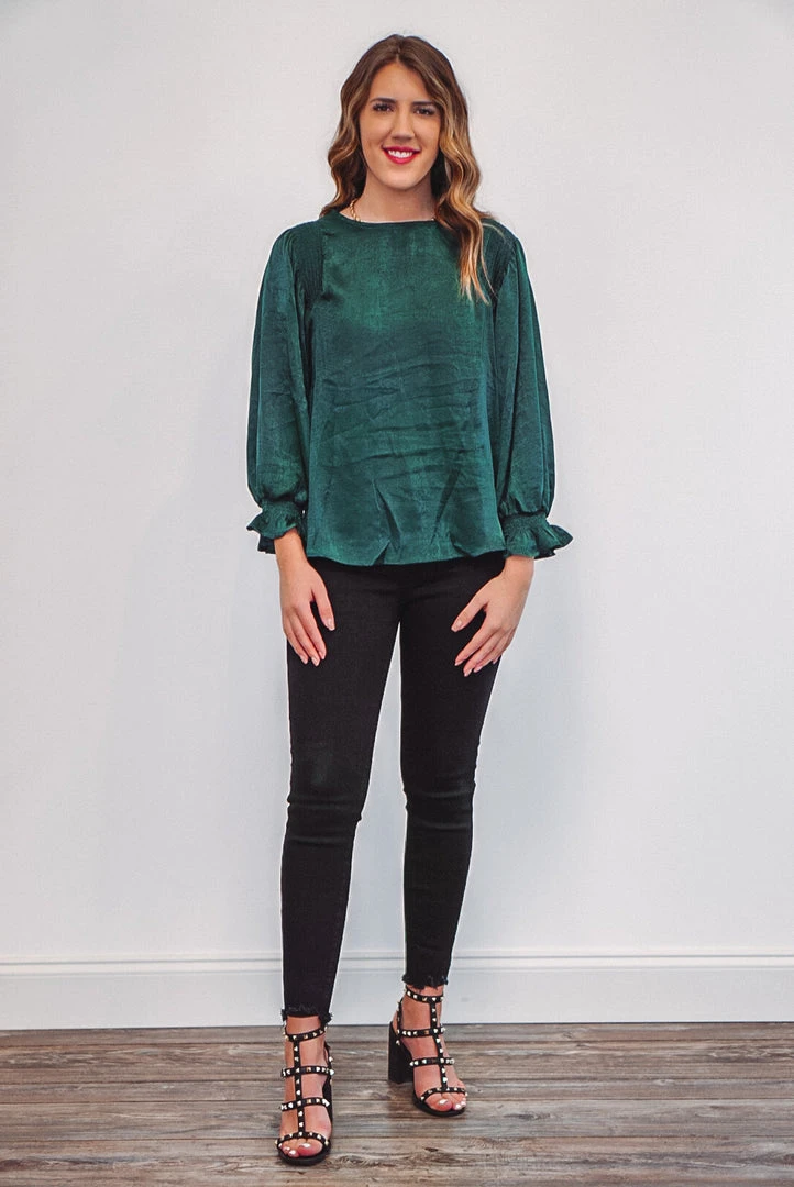Sweet meets sassy in this super cute hunter green blouse. Featuring a satin lightweight fabric, a crew neckline with button keyhole closure in back, smockeing at shoulders, and smocked wrists with ruffle cuffed long sleeves. This one will be perfect dressed up for all of your upcoming events!