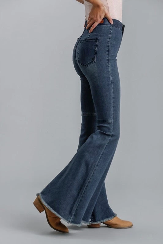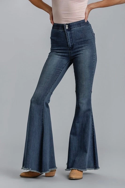 Denim High Rise Super Flared Jeans With Fringed Raw Edge