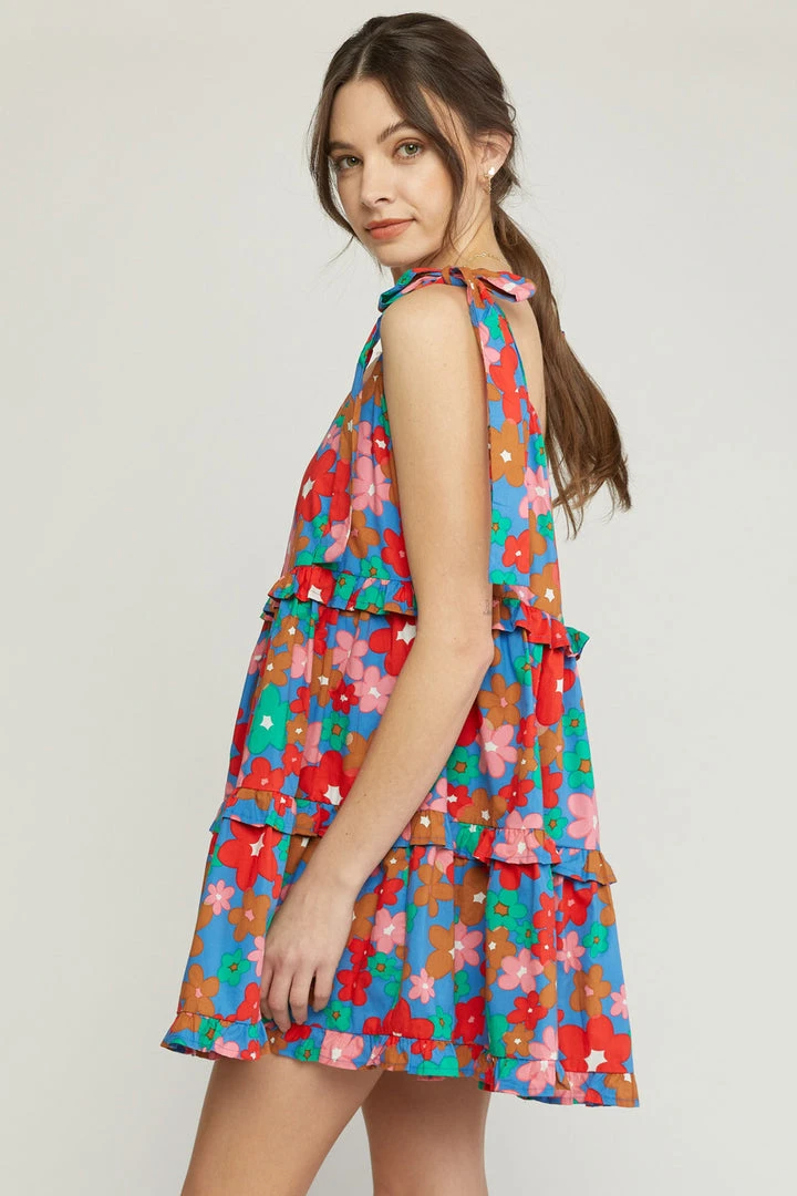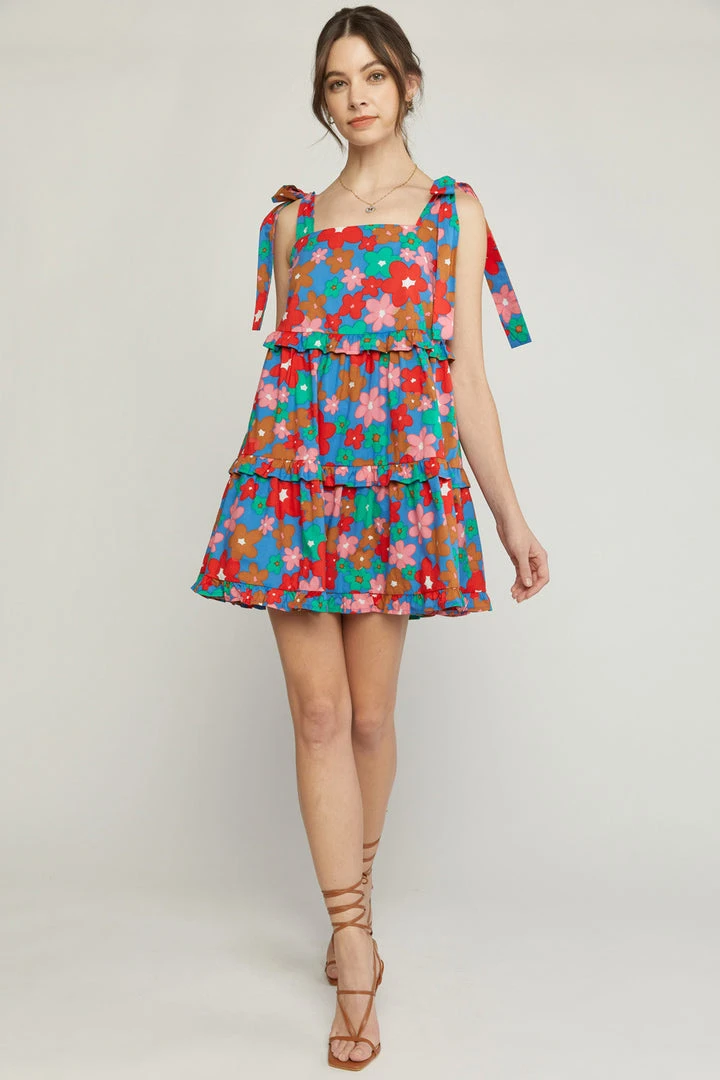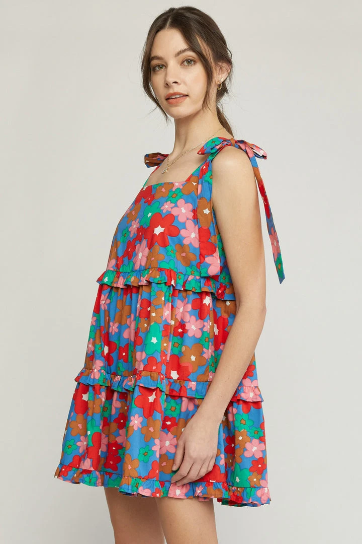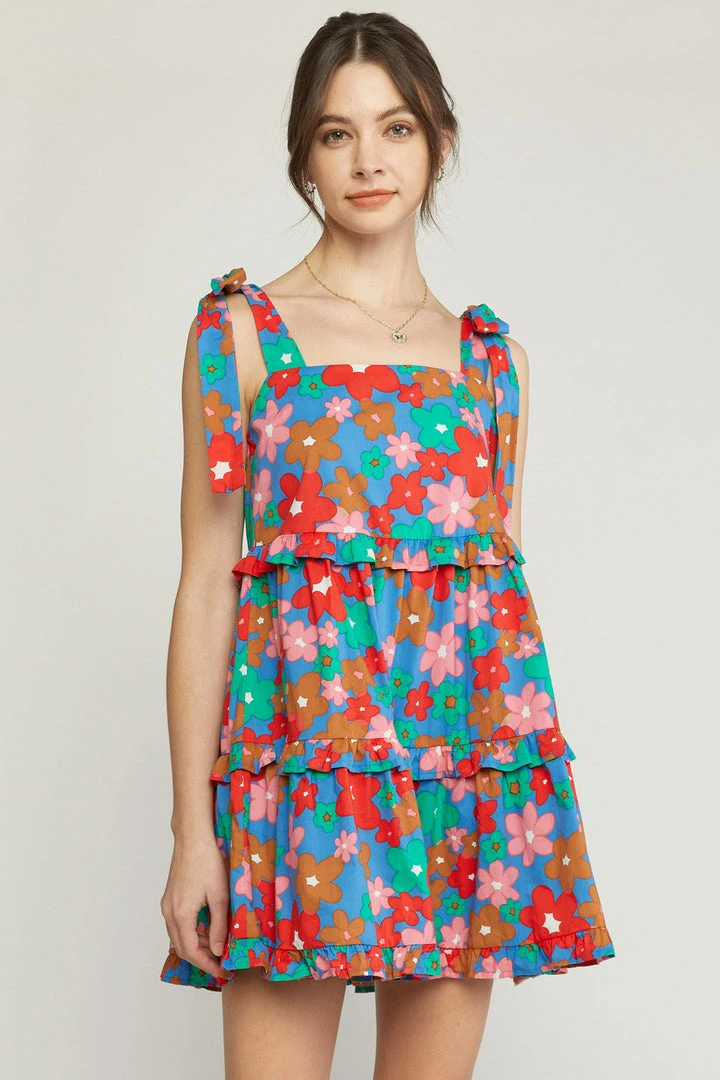 We have all the LOVE for this pretty beauty! Blue ruffle tiered mini dress featuring self tie adjustable shoulder straps and a chic square neckline. This cutie is fully lined, and fits true to size with a flowy lightweight fabric. We know you’re going to love this one as much as we do! Floral colors: tomato red, pink, tan, light brown, and off white.