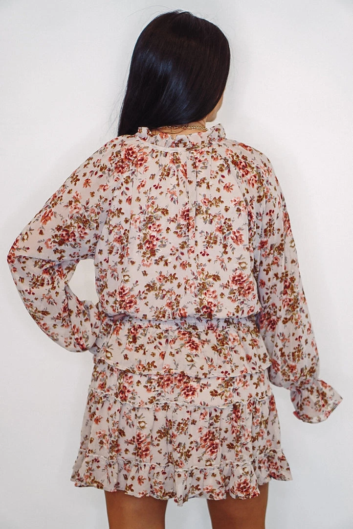 Get ready for all of your favorite upcoming events with this super cute floral print dress! Featuring a self tie closure over the v neckline, with smocked elastic waist, elastic ruffle cuffed long sheer sleeves, and ruffle tiered layers. This pretty babe is a natural color, with floral print of mauve, dark pink, and olive, and is as comfortable as she is cute! Perfect dressed up with heels and a chunky necklace, or dressed down with your favorite cropped denim jacket and booties.