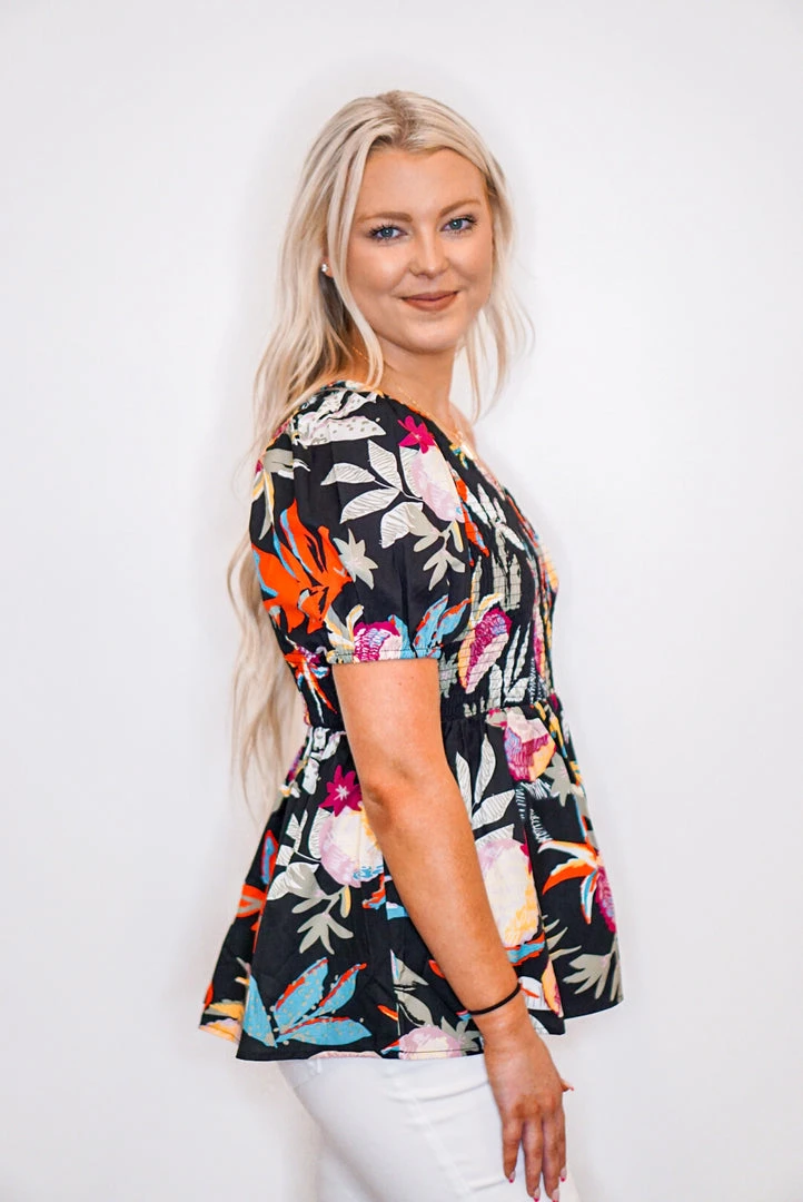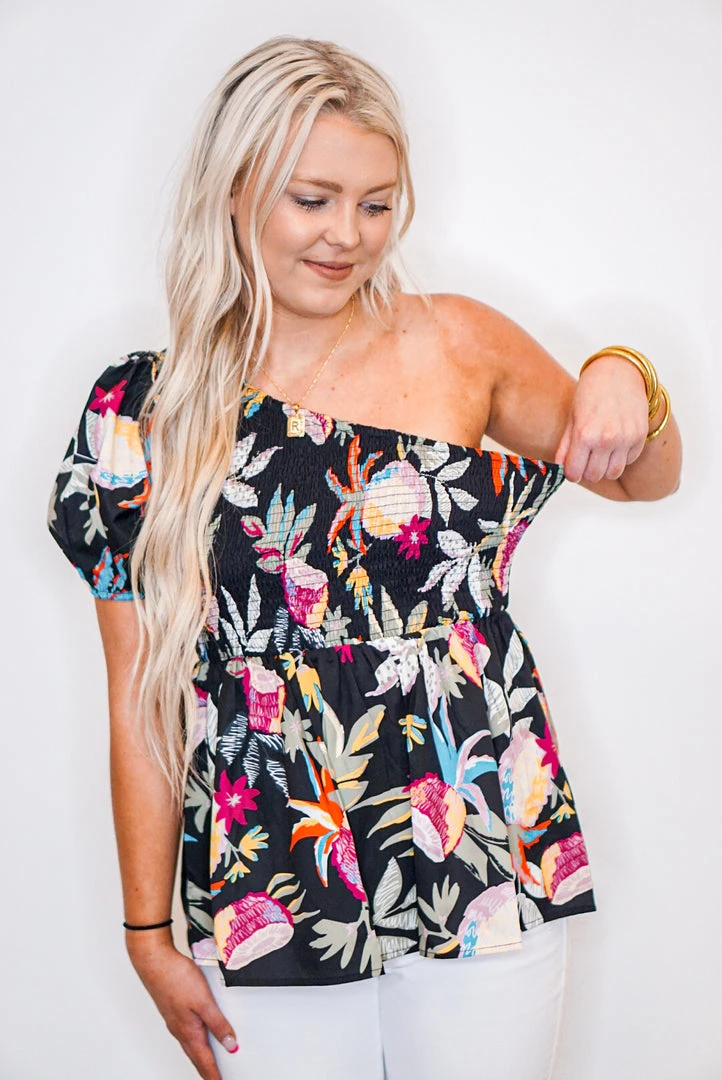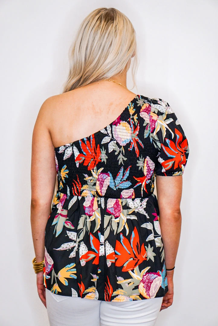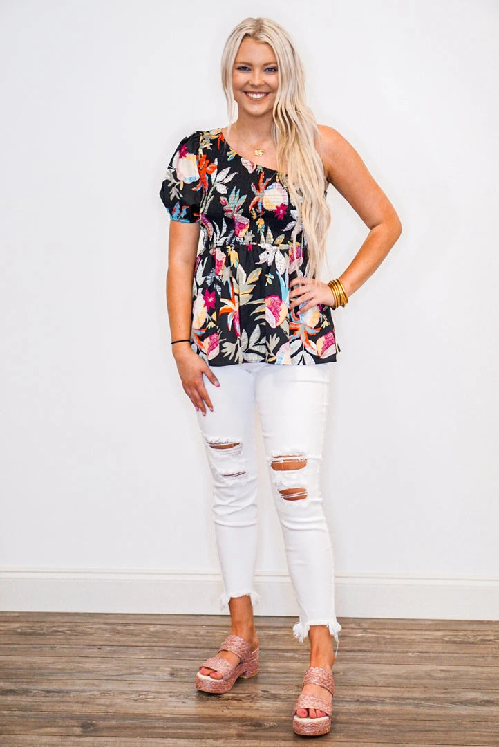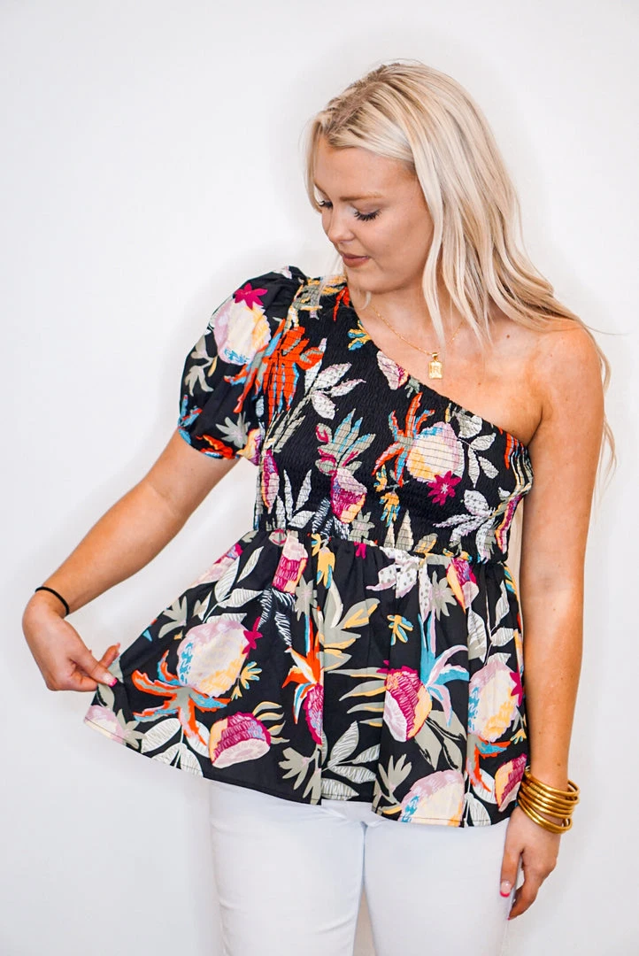 The perfect little babydoll top for all of your upcoming occasions… just add your favorite shorts and wedges and you’re all set. Simple yet fabulous! Black one shoulder blouse with multicolor floral print, featuring an asymmetrical neckline with smocked detail, and puff short sleeve. So cute!