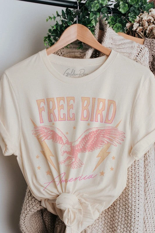 Free Bird!! OMGoodness this is the cutest graphic tee! Loose relaxed fit in vintage white, featuring multi color retro typography ‘Free Bird America’ with an Eagle and lighting bolts. Too perfect!!