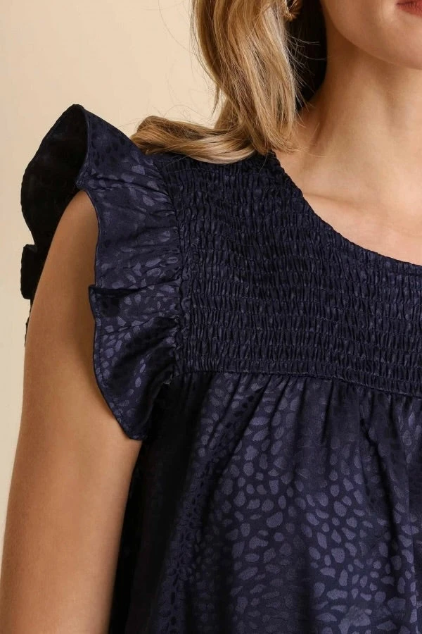 All the heart eyes for this NEW dress!! Classy and sassy with comfort in mind! Navy cheetah print dress features a satin like fabric to dress this babe up! Smocked yoke, key hole closure on back, ruffle flutter short sleeves.