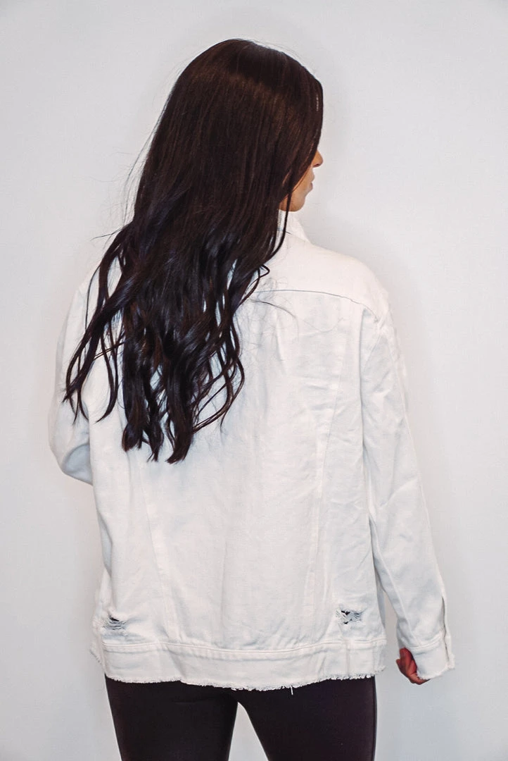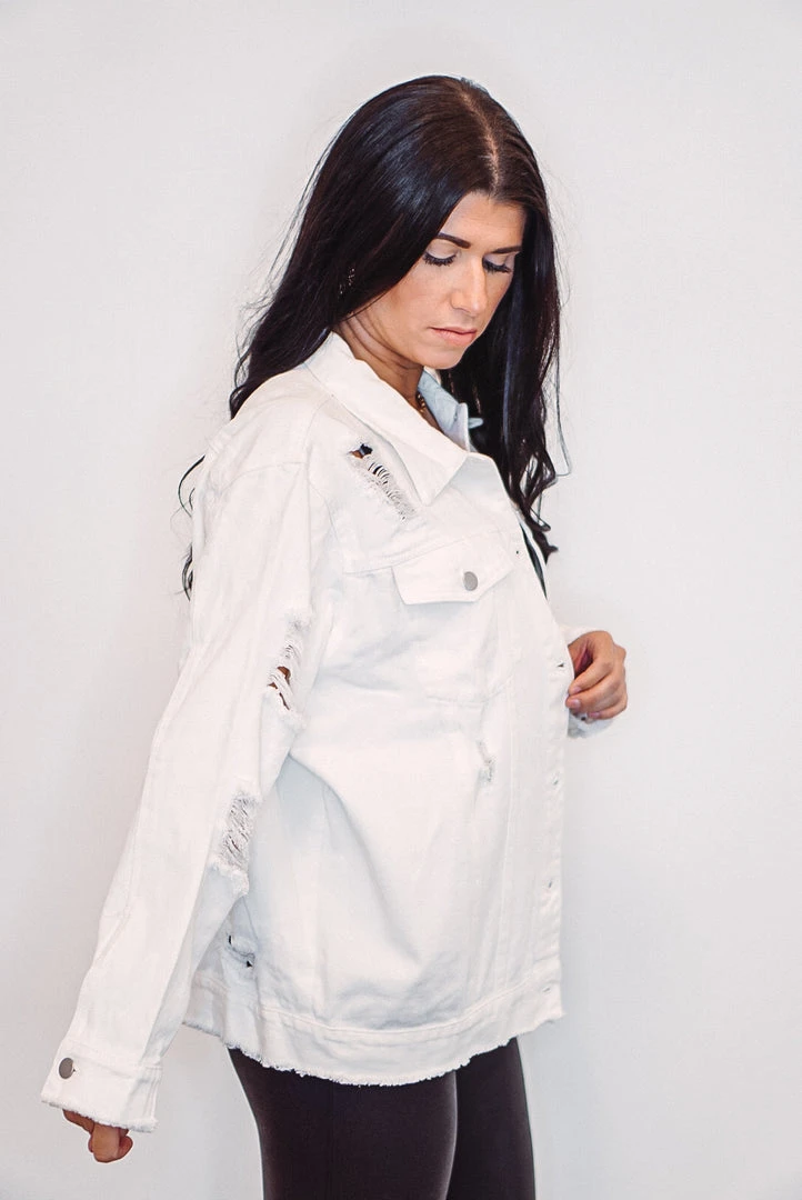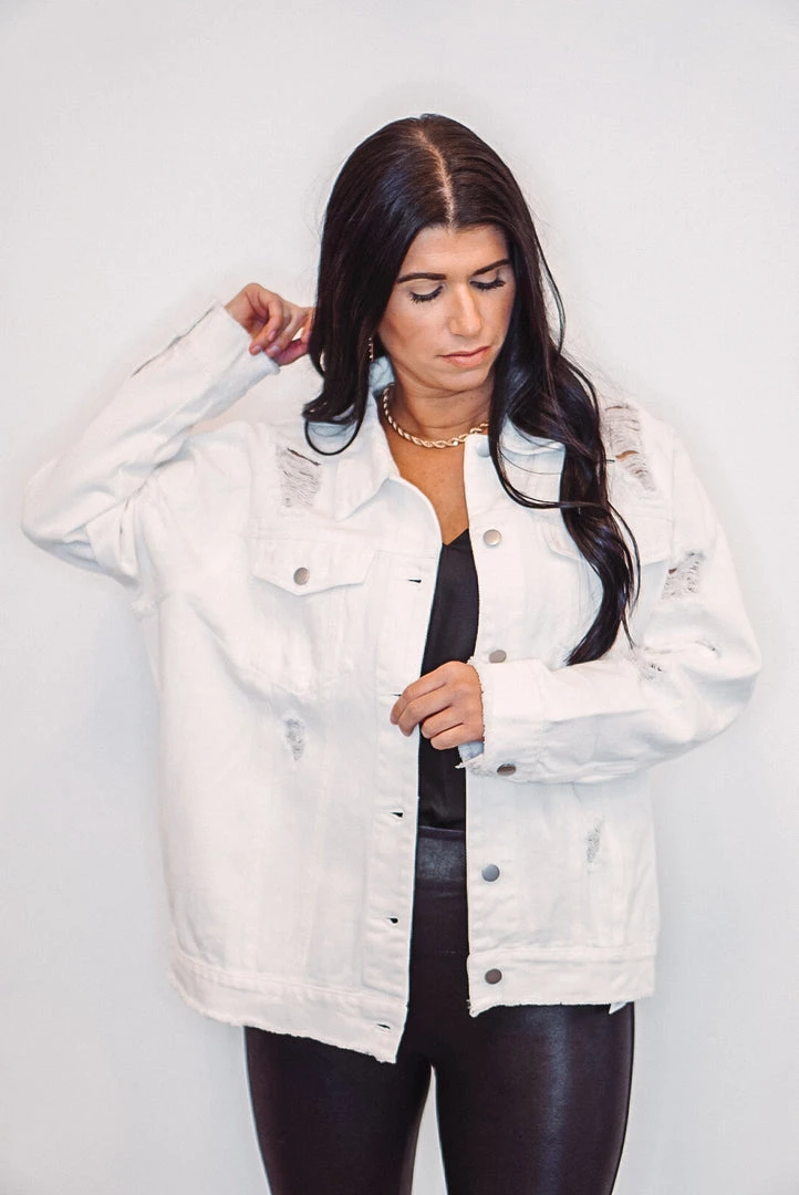 Distressed denim jackets are a MUST and so on trend! This babe has front pockets on the chest, raw hemlines, silver button closure, and the perfect amount of distressing. So cute paired with Spanx leggings and band tees, or over dresses. The options are endless!