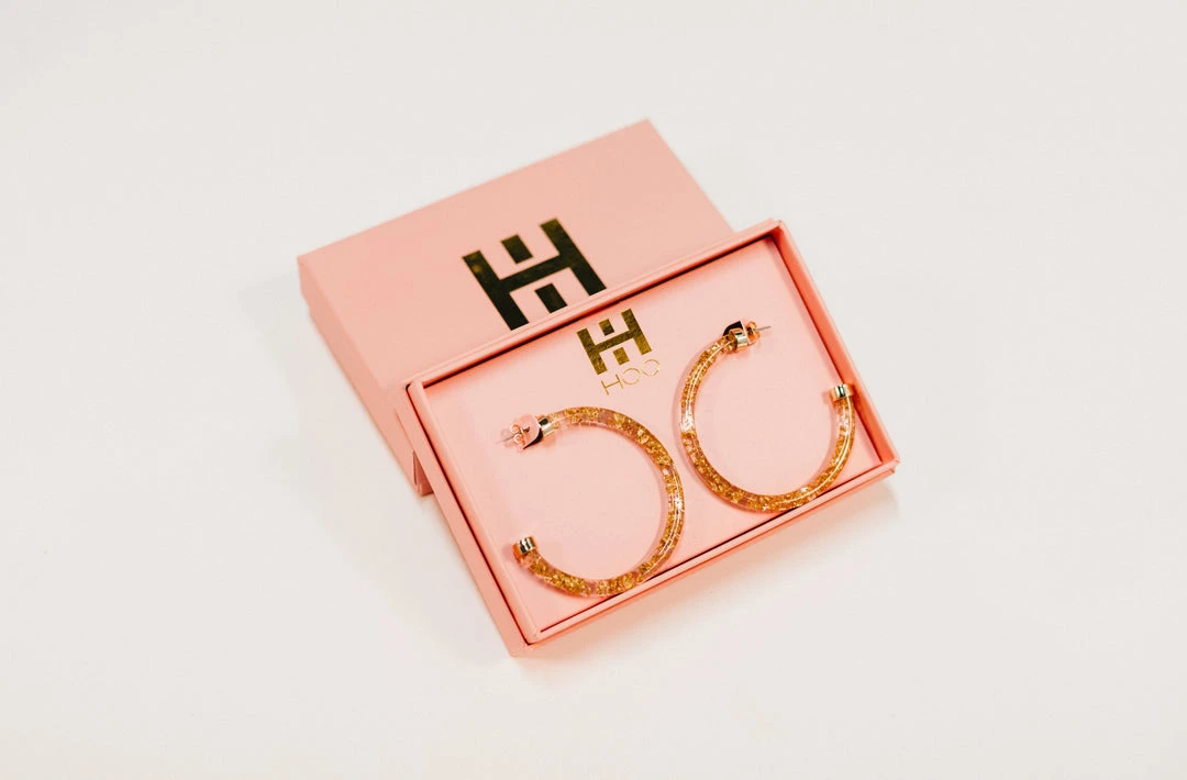 These babes are sooo cute! Acrylic hoop earrings in gold foil, hypoallergenic, and lightweight. Love, love, love!!